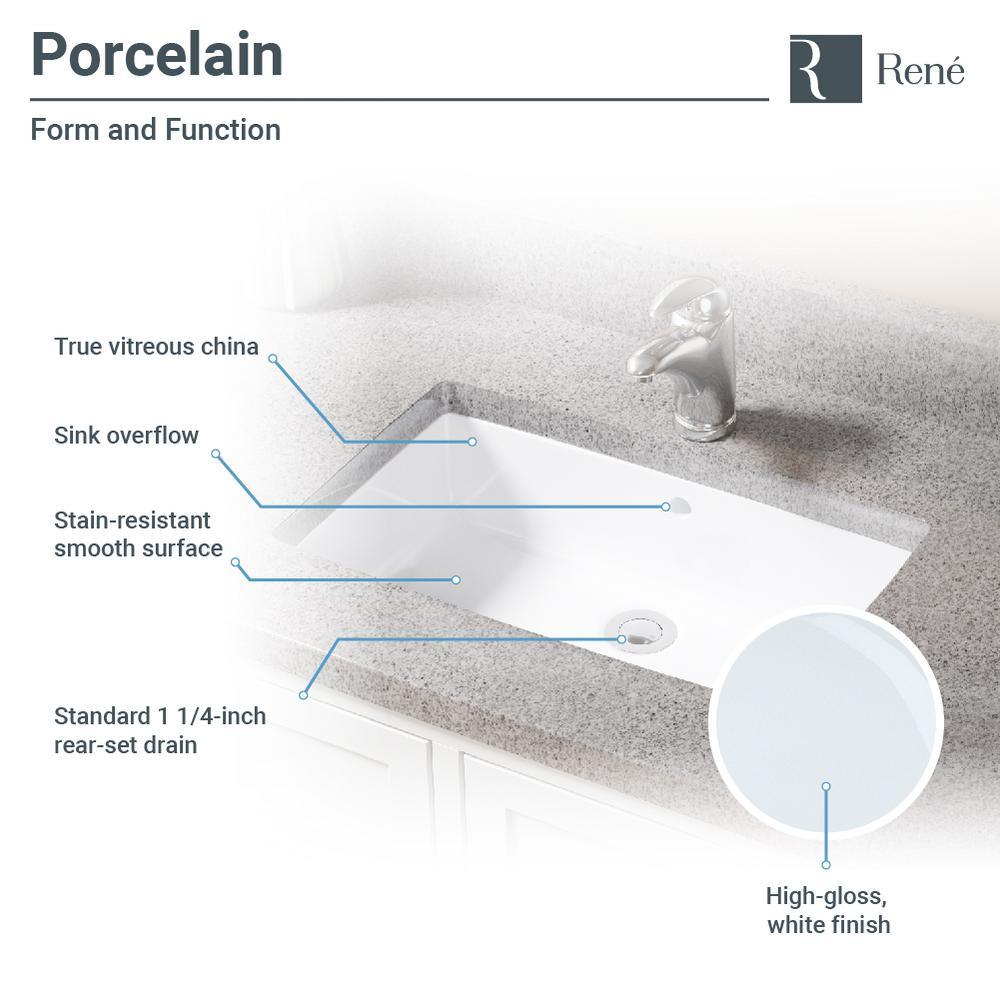 This attractive, white, porcelain basin is designed to be mounted under the counter in a flush, positive, or negative reveal. Wide and narrow, its vitreous china finish glistens with charm and durability. The R2-1001-W is constructed of solid porcelain but with a special additional enamel added at the end of its firing, turning it into a hardened, true, vitreous china. On its own, porcelain is both beautiful and durable, but the additional vitreous china coating creates an even more impervious and sanitary surface. It measures 21-1/2 in. x 14-1/8 in. x 6-3/4 in., with an offset drain and overflow. With a simple press to its handsome, brushed nickel dome; the included, spring-loaded, pop-up drain (pud) can be opened or closed.