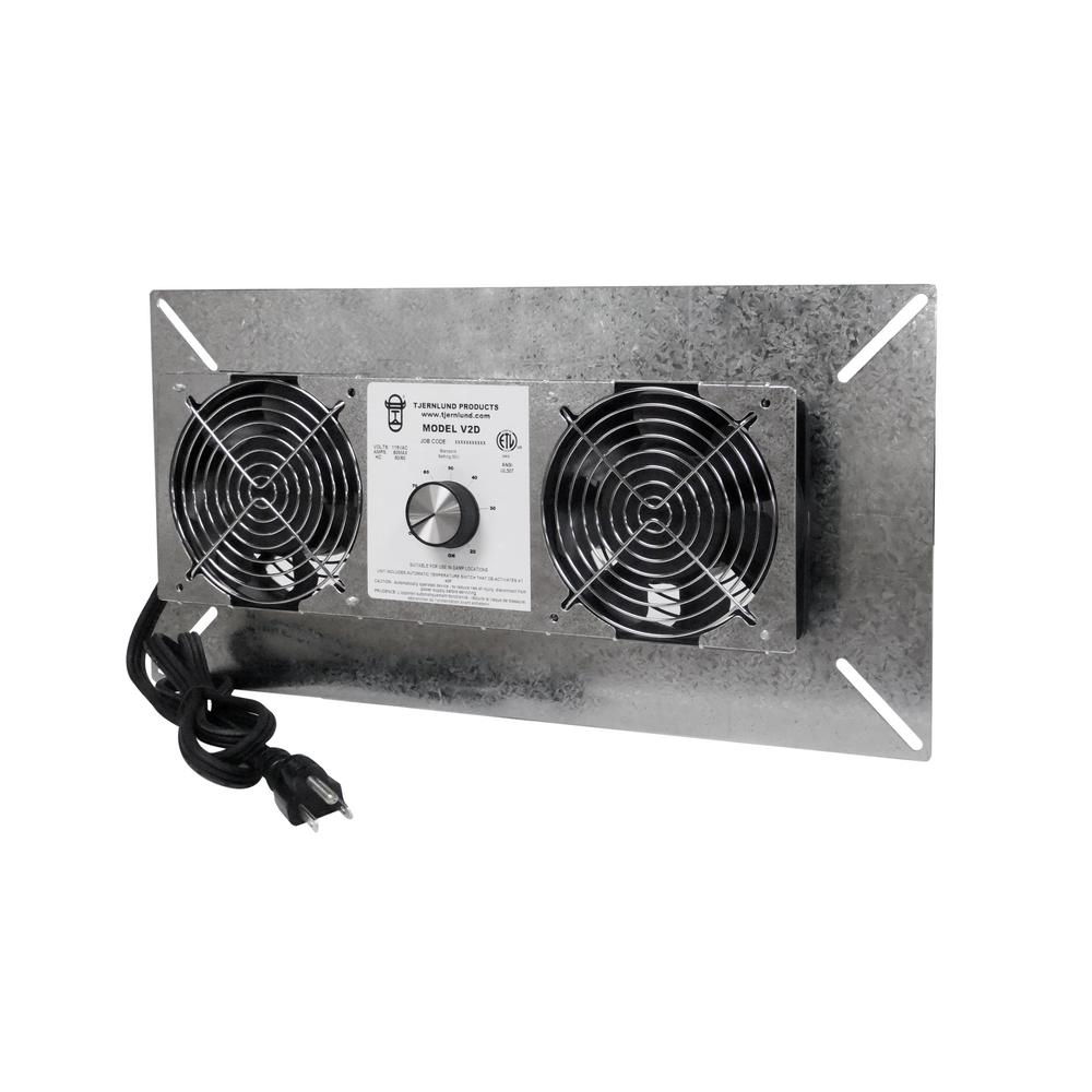 The Tjernlund UnderAire Series V2D Crawl Space Ventilator fan is designed to circulate fresh outdoor air underneath homesand porches. Excessive humidity levels in Crawl Spaces is the leading cause of premature rotting of support columns,joists, floors and beam supports. Humidity can promote fungus growth and increased termite activity. Humidity may alsocause plumbing failures due to rust and corrosion. Constant operation helps vent radon gases, treated wood off-gassingand other odors that might migrate into living areas. The V2D is controlled by a dehumidistat whichactuates the fan if the relative humidity rises above the selected set-point.