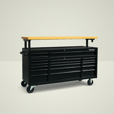 The Husky 72-inch Heavy-Duty Mobile Workbench combines industrial-grade strength with innovative design. Featuring an adjustable-height solid wood top, 18 soft-close drawers, and a built-in power center, this workbench is engineered for both professional and home workshops. Its matte black, all-welded steel construction ensures lasting durability and a modern aesthetic.
