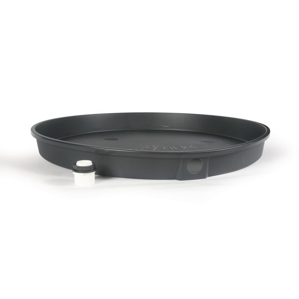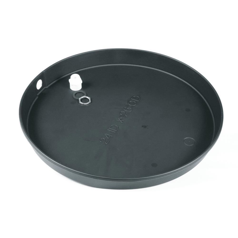 The Camco 22 in. ID plastic water heater pan is made for use under electric water heaters to help protect your floors from leaks or runoff from TandP valve activation. It is made from durable polypropylene plastic and comes with a 1-1/2 in. PVC drain fitting. A drain opening is set in the side to allow you to direct any water to the outside or to the nearest drain.