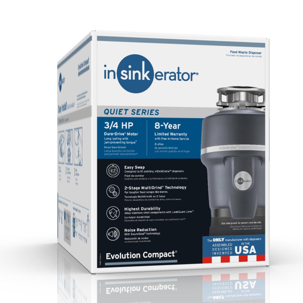 The InSinkErator Evolution Compact 3/4 HP Continuous Feed Garbage Disposal is perfect for small households and houses with restricted cabinet space. It has a 34.6 oz. grind chamber with stainless steel grind components and features MultiGrind technology that allows it to break down hard-to-grind items. It also features our SoundSeal technology, which delivers quiet performance versus a standard disposer.