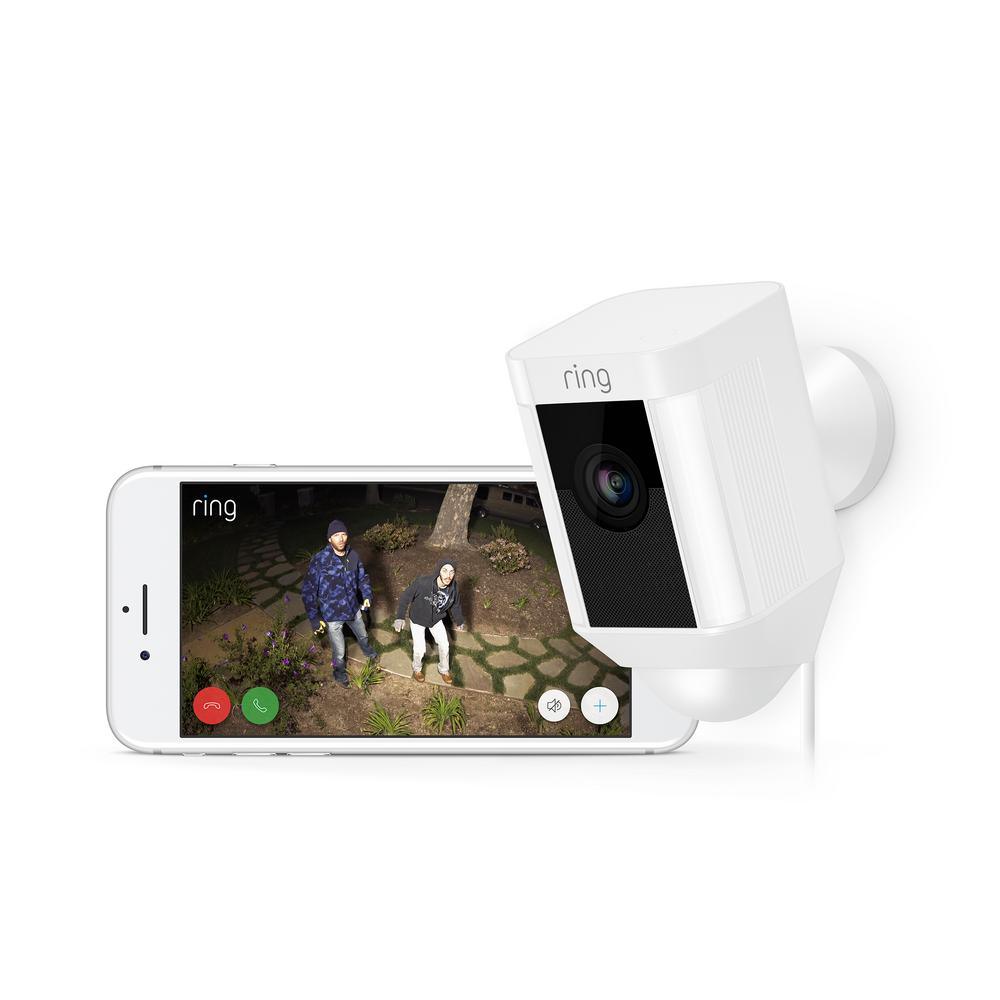 Get non-stop security and non-stop power with Ring Spotlight Cam Wired, a motion-activated security camera with 2-way audio, LED spotlights and a siren alarm. Armed with 1080HD video, custom motion zones and simple plug-and-play installation, Ring Spotlight Cam Wired adds smart security to every corner of your home. Ring Spotlight Cam Wired lets you create and customize your own motion zones, so you can focus on the most important areas of your home. When anyone steps on your property and triggers your motion sensors, you'll get an instant alert on your phone, tablet and PC. Answer the alert, and you can see, hear and speak to people on your property from anywhere. Ring also lets you check-in on your property at anytime with Live View, so you can get streaming video and audio right at your fingertips. Its built-in night vision and LED spotlights allow you to protect your home around the clock and get high-quality HD video in any setting. And if you catch a suspicious person at your home, you can sound the 110-decibel alarm to scare them away. Ring Spotlight Cam Wired plugs into standard power outlets, so you'll never have to worry about charging a battery, and it comes with everything you need to get your camera setup in just a few minutes. With your purchase, you'll also get a free 30-day trial of Ring Video Recording, so you can review, save and share all your videos at anytime. Extend the reach of your Ring products with the Chime Pro Wi-Fi extender.
