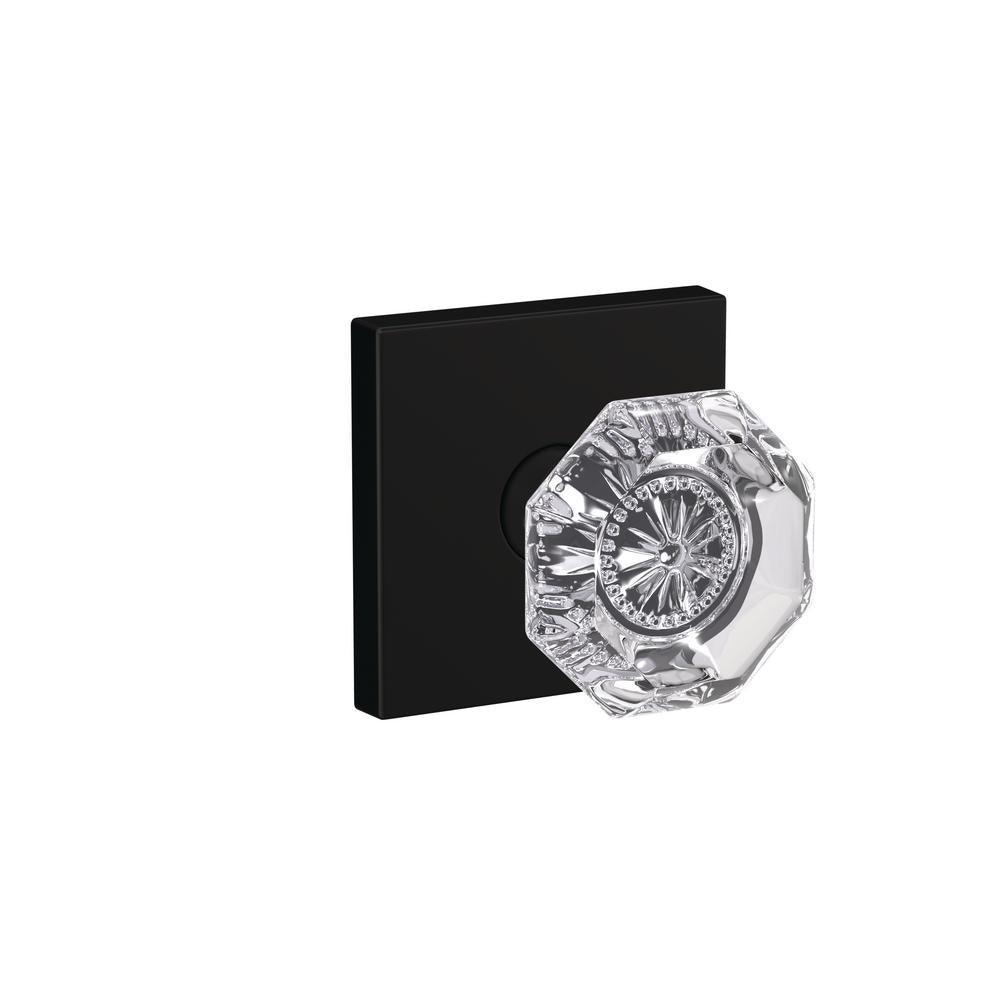 The Schlage Custom Alexandria Glass Knob with Collins Trim Passage and Privacy Lock in Matte Black is uniquely designed to work on both Hall/Closet and Bed/Bath doors. It’s easy to switch between locking and non-locking functions. Just insert or remove the locking pin from the pinhole on the interior side of the hardware. Schlage Custom hardware is also designed with premium style in mind, featuring low profile trim and concealed screws for a more polished look. Inspired by the Victorian era, the Alexandria glass knob is multi-faceted with classic detailing sparkling in the center, while the Camelot trim’s scalloped architectural details make any room charming and approachable. The striking appearance of the Matte Black finish creates an elegant look that’s sure to be noticed in any style setting.