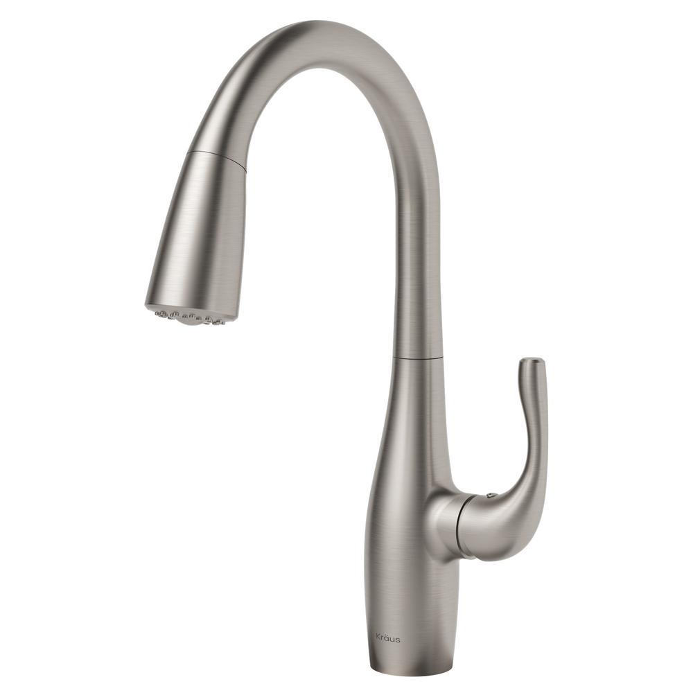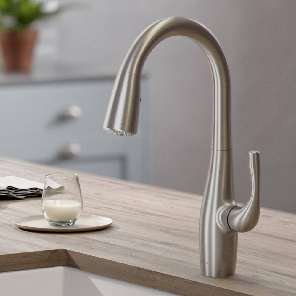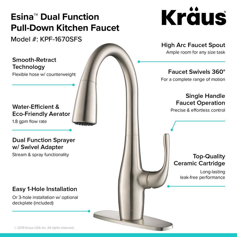 Upgrade your kitchen with the sleek transitional style of the Esina kitchen faucet. The streamlined pull-down design features an ergonomic dual-function spray head that offers an aerated stream and powerful rinsing spray, allowing you to easily switch between spray patterns at the touch of a button. A flexible nylon hose with swivel adaptor offers unparalleled range of motion and effortless movement all around the sink. An optional deck plate (included with purchase) allows you to install this single handle faucet with a 1, 2, or 3-hole sink. Available in all-Brite Spot Free Stainless-steel finish, which helps to prevent fingerprints and requires less cleaning.