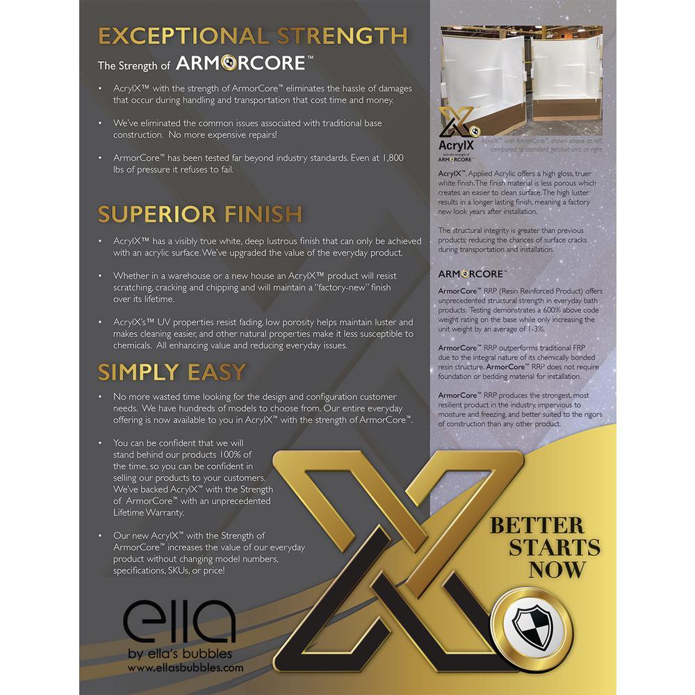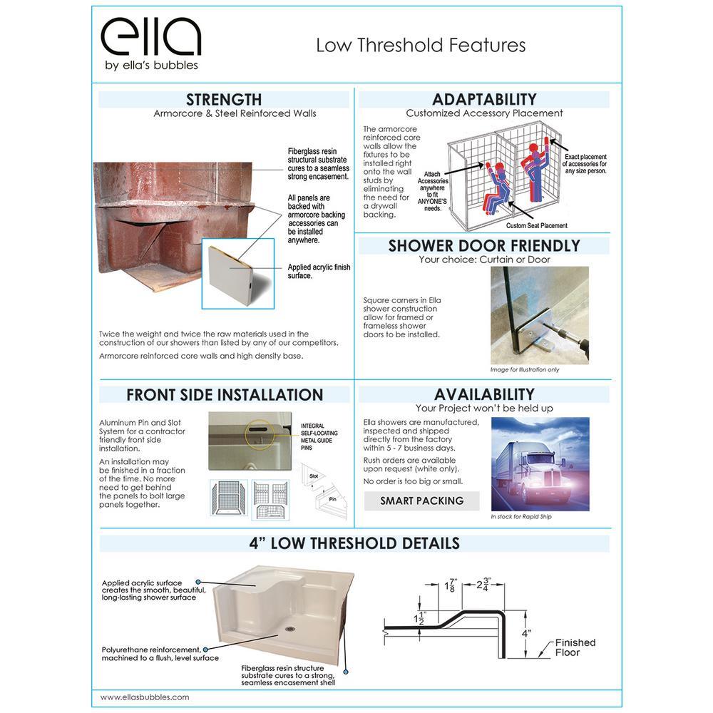 The Ella Low Threshold Plus 24 Shower Package has a 4 low threshold, 2 chrome strainer brass drain with friction seal and 3 color options (white, bone or biscuit). These showers systems feature a molded 21 seat choose a left or right seat location when ordering (drain will be the opposite the seat). This system also comes with the Ella Plus 24 Accessories Package, which comes with three 24 satin finish straight stainless steel grab bars. These allow for custom positioning, as they are not pre-installed. Acryl, Applied Acrylic offers a high gloss, truer white finish. The finish material is less porous which creates an easier to clean surface. The high luster results in a longer lasting finish, meaning a factory new look years after installation. The structural integrity is greater than previous products; reducing the chances of surface cracks during transportation and installation. For further details contact Ella at 1-800-480-6850.
