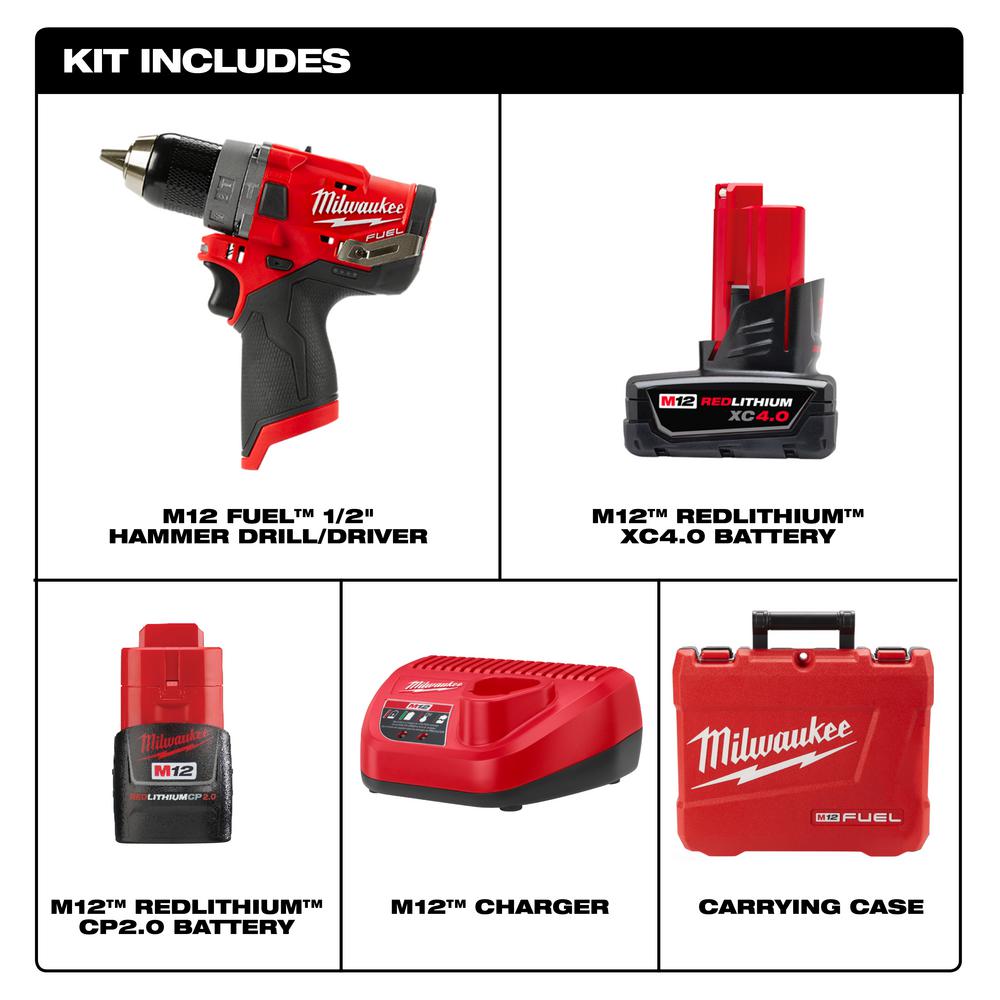 This 1/2 in., 12-Volt hammer drill kit is lightweight and compact with the power to perform a range of applications. Its brushless motor delivers 1700 RMPs and 350 in./lbs. of torque. This portable drill weighs just 2.3 lbs., which is great for overhead positions. It measures 6.6 in. long, helping you access tight spaces with ease. This reliable tool features REDLINK Plus Intelligence to protect it from overloading and overheating. It uses REDLITHIUM battery packs to deliver more work per charge. This power drill includes a 1/2 in. metal chuck for maximum grip and bit retention. It comes equipped with a drill driver and belt clip.