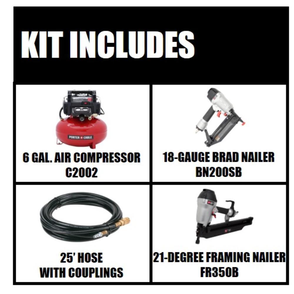 The Porter-Cable 6 gal. Portable Electric Air Compressor Combo Kit features 2-regulated, factory-installed air couplers to easily support 2 users. Its body is made with steel for strength and has an upgraded shroud and console cover to protect its vital components. It is designed to operate at or below 150 PSI and also features an oil-free pump, eliminating the need for maintenance. This combo kit also includes the BN200C 18-Gauge 2 in. brad nail, 25 ft. air hose and 100 brad nails. For a limited time get a bonus 21° 3-1/2 in. Full Round Framing Nail with purchase.