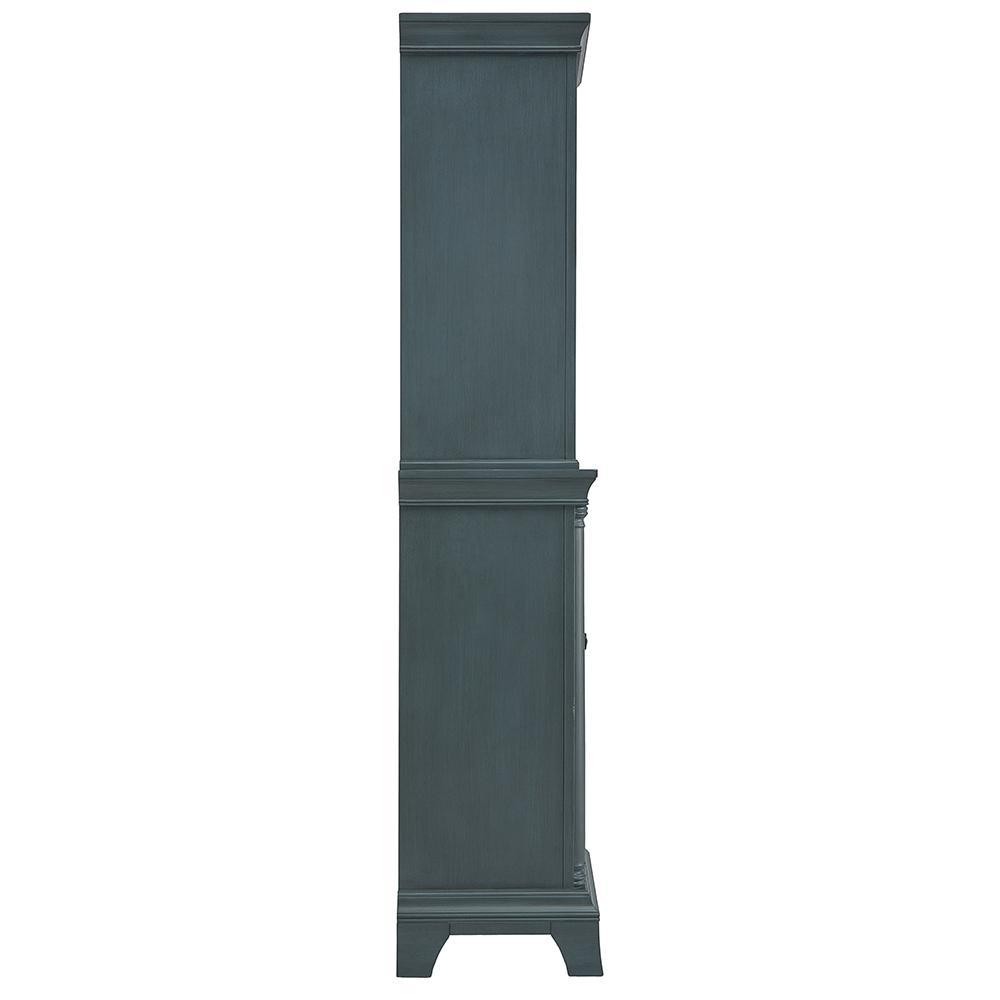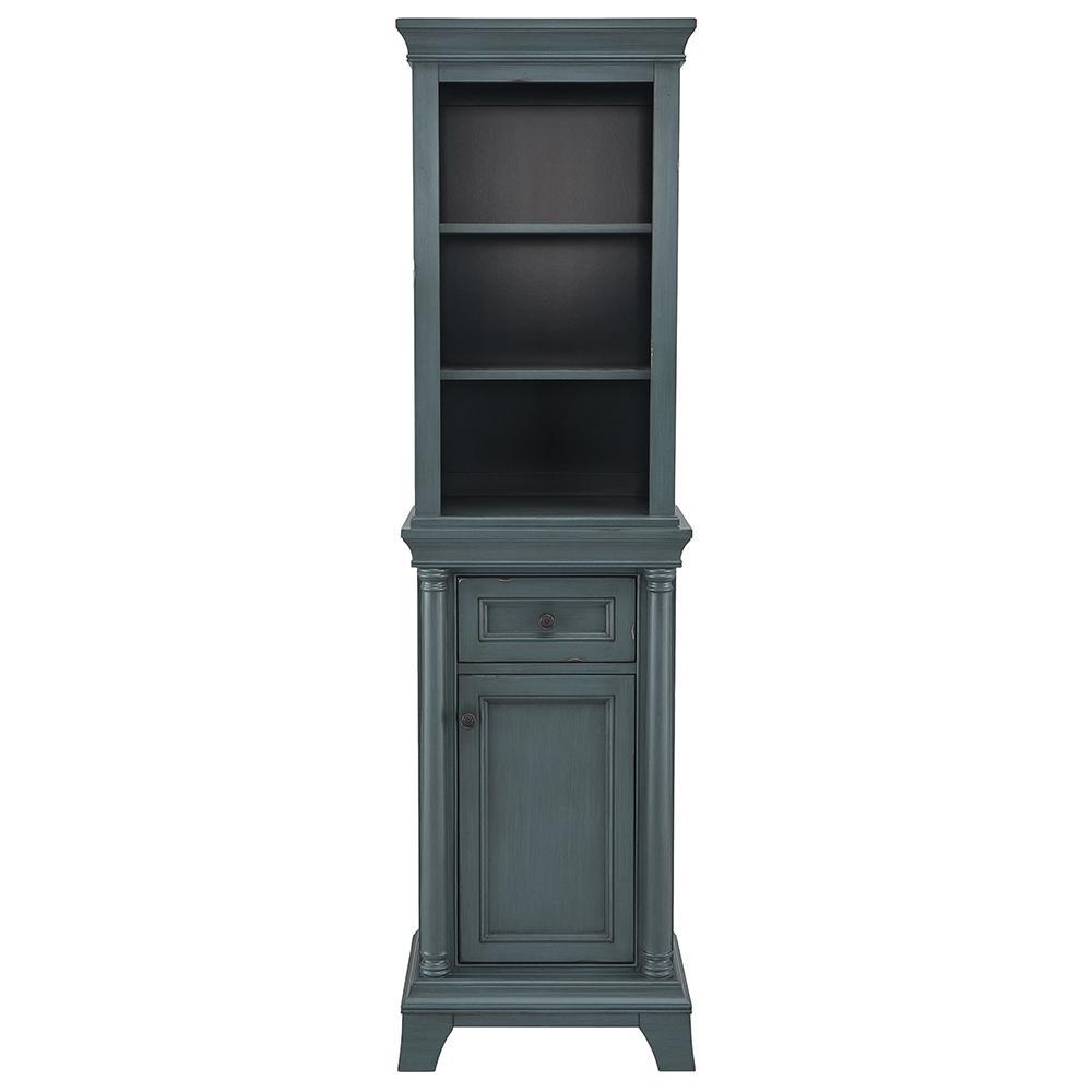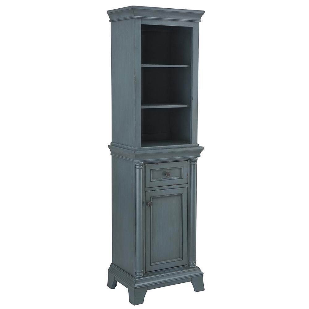 Make an upscale, elegant impression with the 72 in. tall Strousse linen cabinet This intriguing Distressed Blue Fog finish cabinet features open shelving, a cabinet with an adjustable interior shelf, and a full extension soft-closing drawer to solve all storage needs. Dark Pewter round knobs give sharp contrast, while stately columns round out this furniture-style piece. Create a complete bathroom that leaves visitors envious with this linen cabinet and all its coordinating pieces in the Strousse collection.