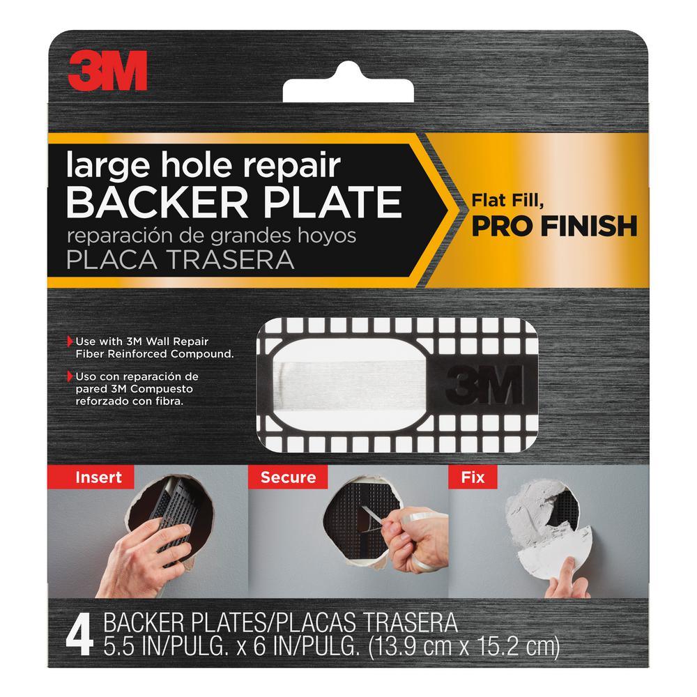 The 3M Large Hole Repair Backer Plate is designed to use with 3M Wall Repair Fiber Reinforced Compound. This is an innovative large hole repair product that allows every DIYer to fix their walls like a professional. Using this new behind-the-wall system and fiber reinforced compound allows an easy fix for holes ranging from 3 in. to 5 in.