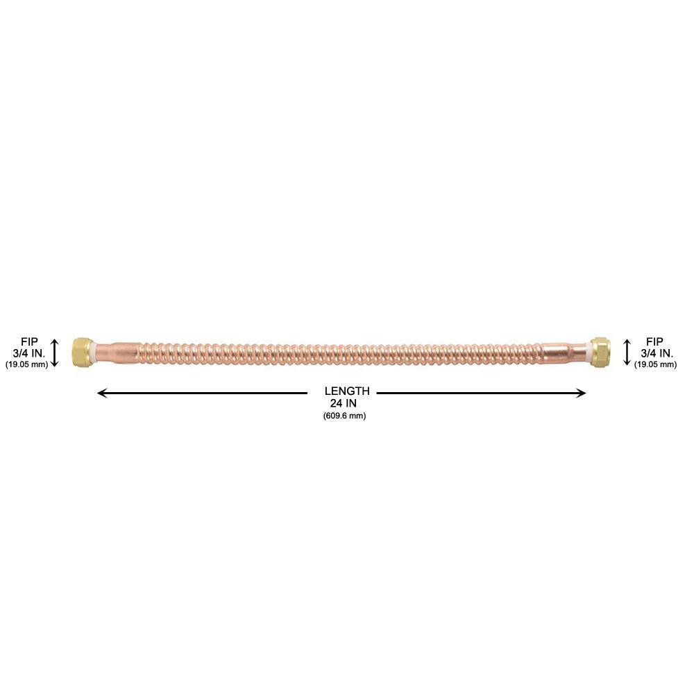 HOME-FLEX 3/4 in. MIP x 3/4 in. FIP x 24 in. L Copper Corrugated Water Connector is designed for use in residential and commercial applications for water heater hookups. It is flexible, corrosion resistant and has attached end fittings with built-in dielectric collars. It is the ideal choice for homeowners and contractors alike.