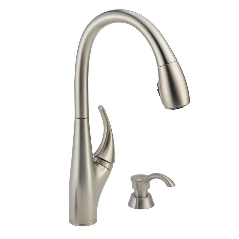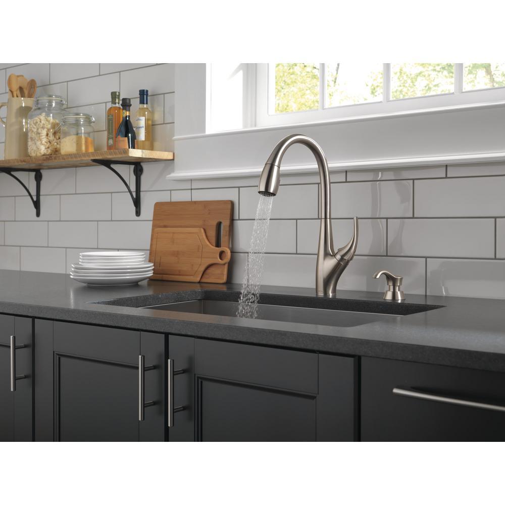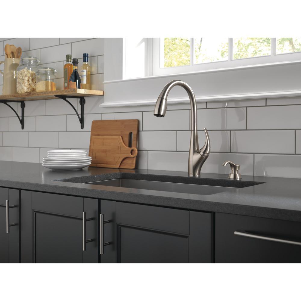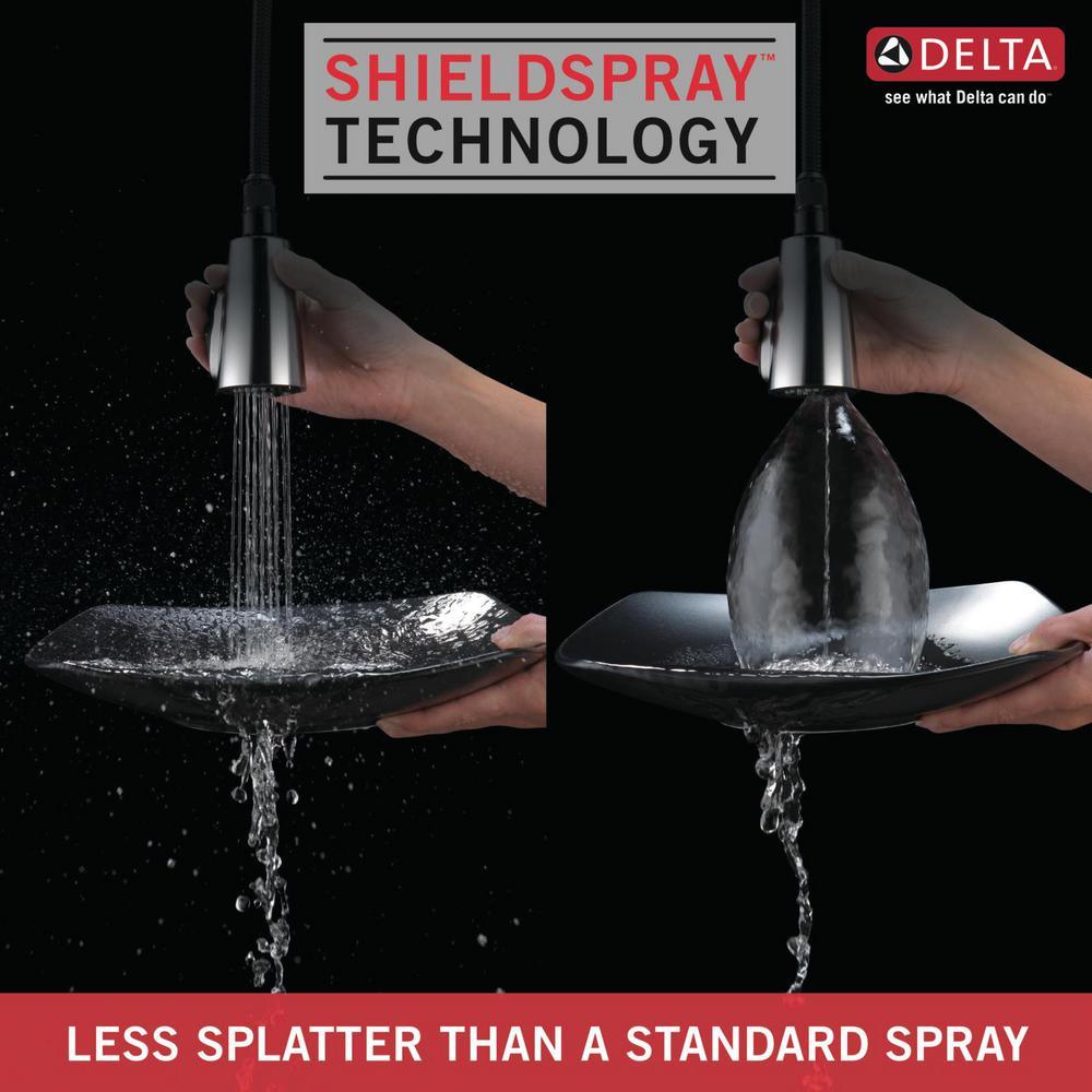 Delta MagnaTite Docking uses a powerful integrated magnet to pull your faucet spray wand precisely into place and hold it there so it stays docked when not in use. Delta ShieldSpray Technology cleans with laser-like precision while containing mess and splatter. A concentrated jet powers away stubborn messes while an innovative shield of water contains splatter and clears off the mess, so you can spend less time soaking, scrubbing and shirt swapping. Delta faucets with DIAMOND Seal Technology perform like new for life with a patented design which reduces leak points, is less hassle to install and lasts twice as long as the industry standard. Kitchen faucets with Touch-Clean Spray Holes allow you to easily wipe away calcium and lime build-up with the touch of a finger. You can install with confidence, knowing that Delta faucets are backed by our Lifetime Limited Warranty. Industry standard is based on ASME A112.18.1 of 500,000 cycles.