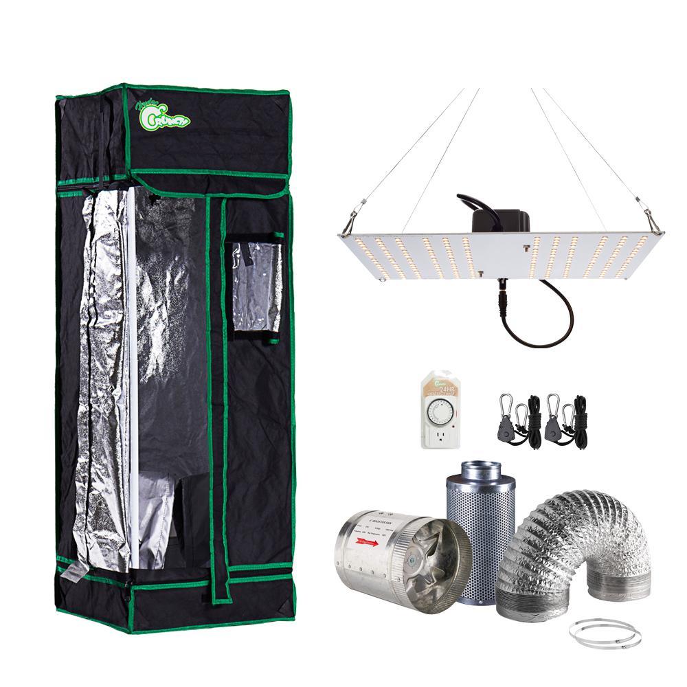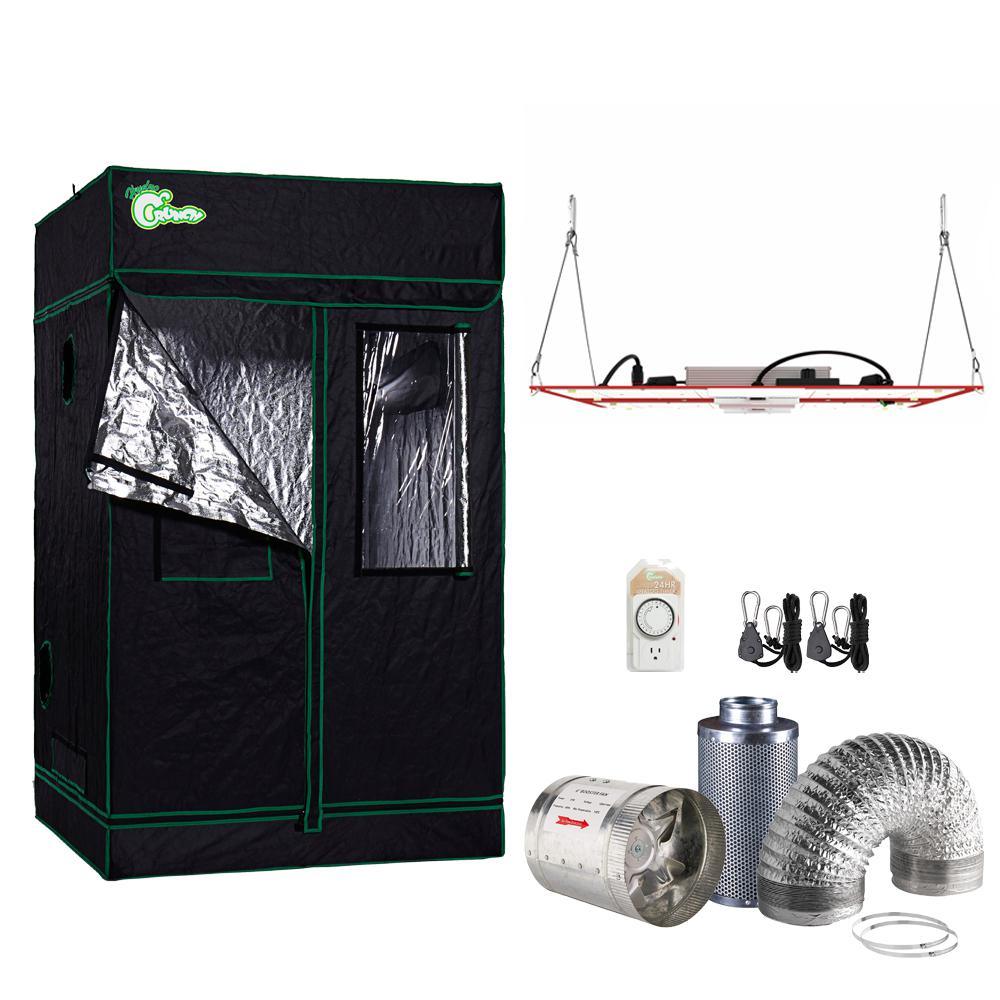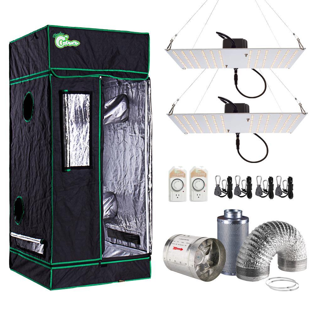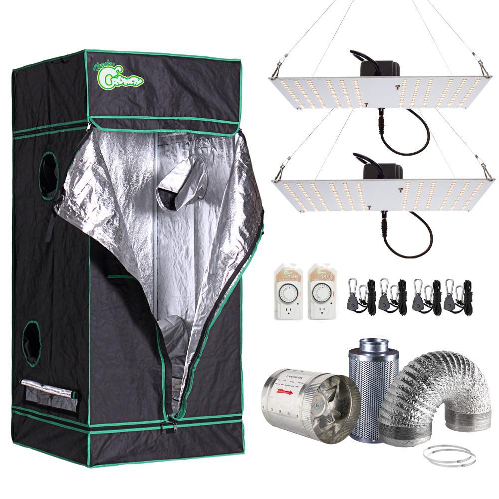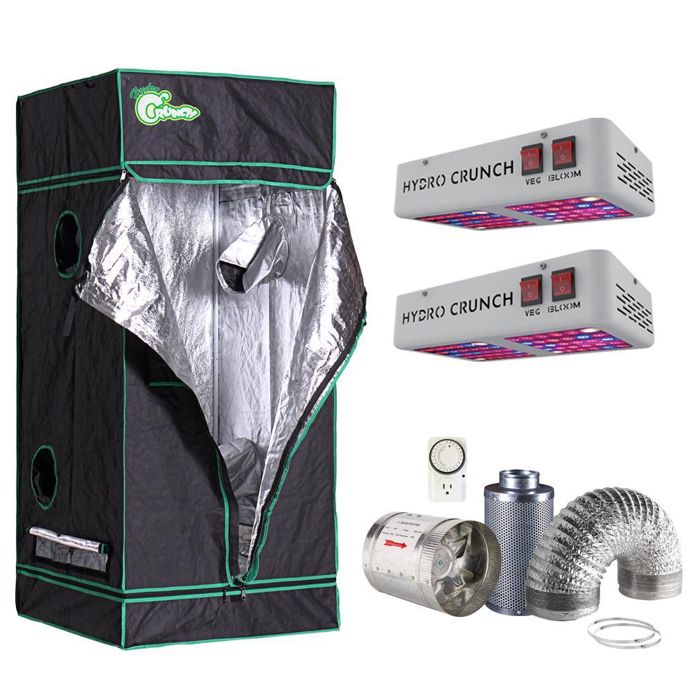 - Comes complete with two (2) Hydro Crunch 600-Watt Equivalent Full Spectrum LED Fixture (True 240-Watt), 4 in. Hydro Crunch Inline Duct Booster Fan 100 CFM, Hydro Crunch 4 in. x 12 in. Virgin Carbon Filter and 4 in. x 25 ft. Non-Insulated Air Duct, 25 ft. long, Grow Tent 48 in. x 48 in. x 80 in. (4 ft. x 4 ft. x 6.5 ft.), timer and adjustable light ratchet hangers
