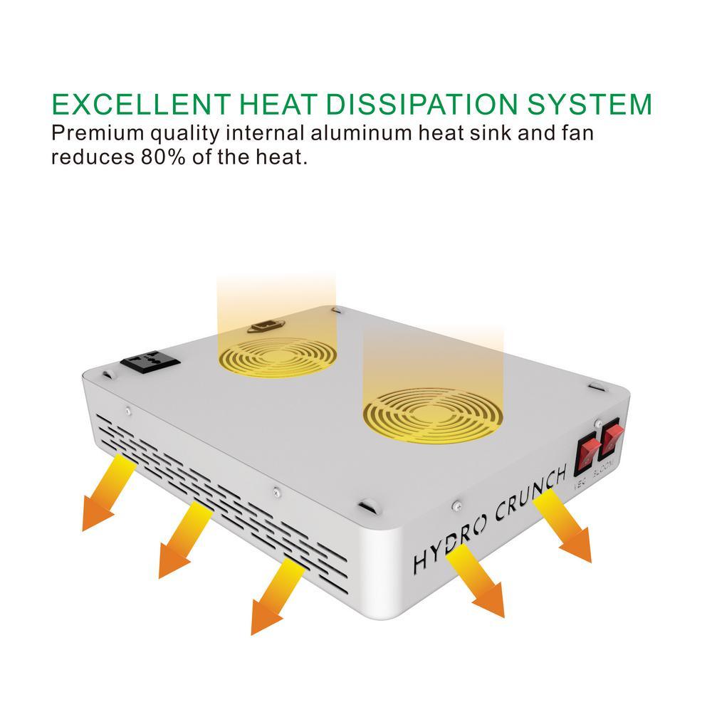 Hydro Crunch 600-Watt LED Grow Light Full Spectrum is ideal for all kinds of indoor plants veg and flower at all growth stages. 3-year warranty and CE Certified. With aluminum cooling heat sinks and high speed quite cooling fans, run 70% cooler than (HID) lights. Specifications: replaces a 600-Watt HPS/MH. Dimensions: 15.6 x 12.6 x 3.0 in. Item weight: 13.3 lbs. LED Output Power: 120pcs 5-Watt. LED Type: High efficiency 5-Watt Epistar LEDs. Package includes: 2 x Hydro 600-Watt LED Full Spectrum, 2 x Hanging Kit, 2 x 6 ft. Power Cord (US Standard 110-Volt grounded 3 prong plug). Attention please: extremely bright, do not look directly at the LED bulbs when the light is working. Indoor use only, not water-proof. No extra ballast is needed. Can be controlled by Timer. Our Hydro Crunch Heavy Duty Grow Tent 48 in. x 48 in. x 80 in. (4 ft. x 4 ft. x 6.5 ft. ) is made of all metal construction. Interior of our grow tents use 300D oxford cloth Mylar fabric that can achieve more than 100% reflective. Multiple vents to accommodate fans and filter. Ventilation window, air and cable vents are carefully designed and located to minimize the loss of lumen. Our Hydro Crunch Inline Duct Booster Fan can help you to maintain a healthy grow room by efficiently move large volumes of air throughout your ventilation system. For high-powered ventilation and noise reduction, our inline booster fan runs 50% quieter than leading competitors.
