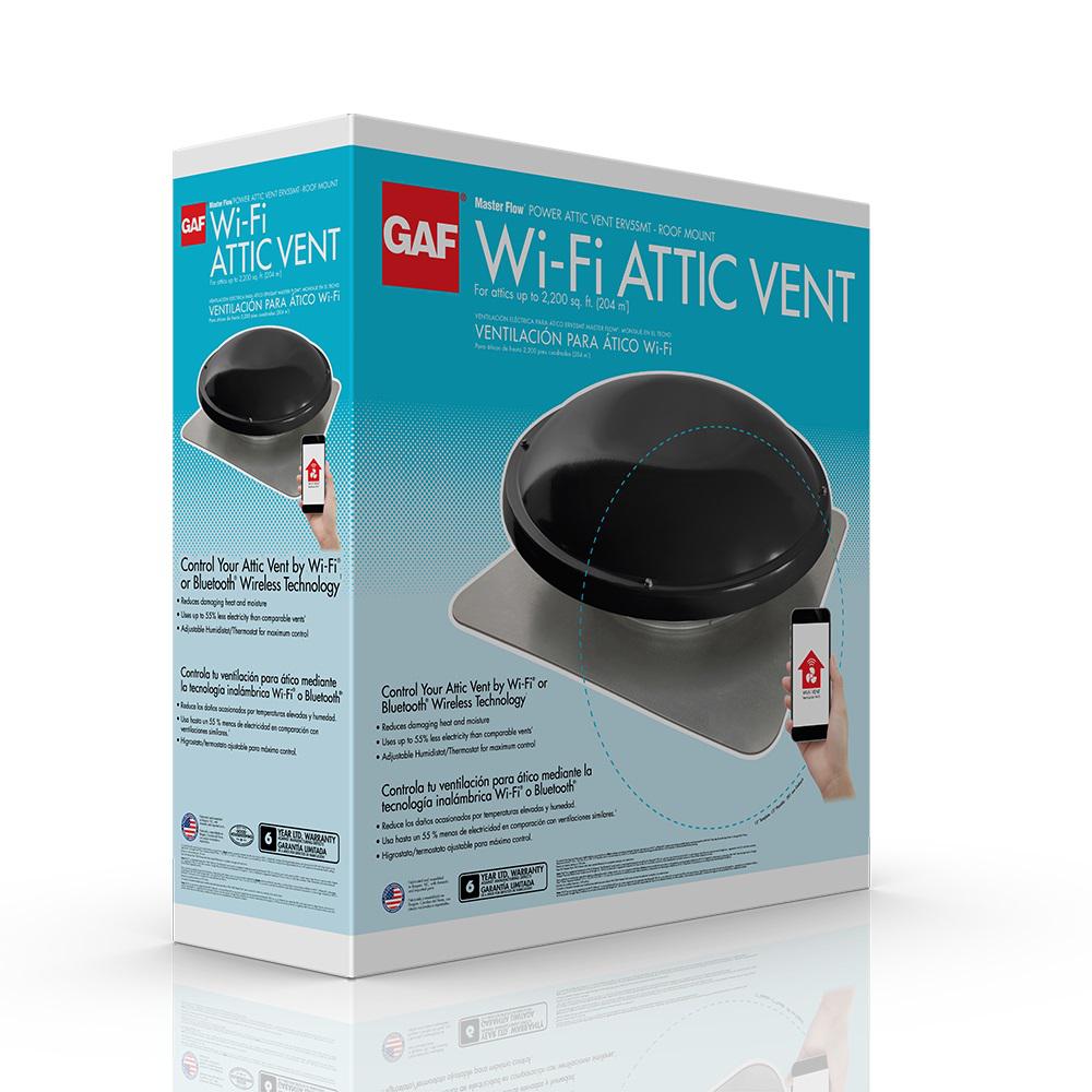 The GAF Master Flow roof-mounted Wi-Fi Power Attic Vent allows you to control your attic vent from your couch. A great investment in attic ventilation, this next generation technology allows you to connect directly to the vent via a Wi-Fi or Bluetooth technology-enabled device to monitor and adjust the vent’s thermostat and humidistat for maximum efficiency and performance.* This smart feature make it easy to control your attic vent in order to reduce heat and moisture in your attic for maximum comfort. It’s even great for use in a garage, and it’s simple to operate — just download the GAF Wi-Fi Vent App and use your smart phone or tablet to control the vent. This efficient attic vent can move air at the rate of 1250 cu. ft. per minute and is designed for attics up to 2200 sq. ft.