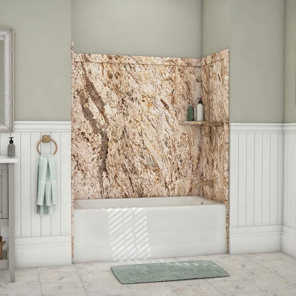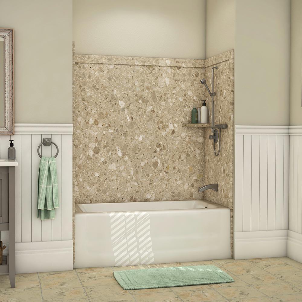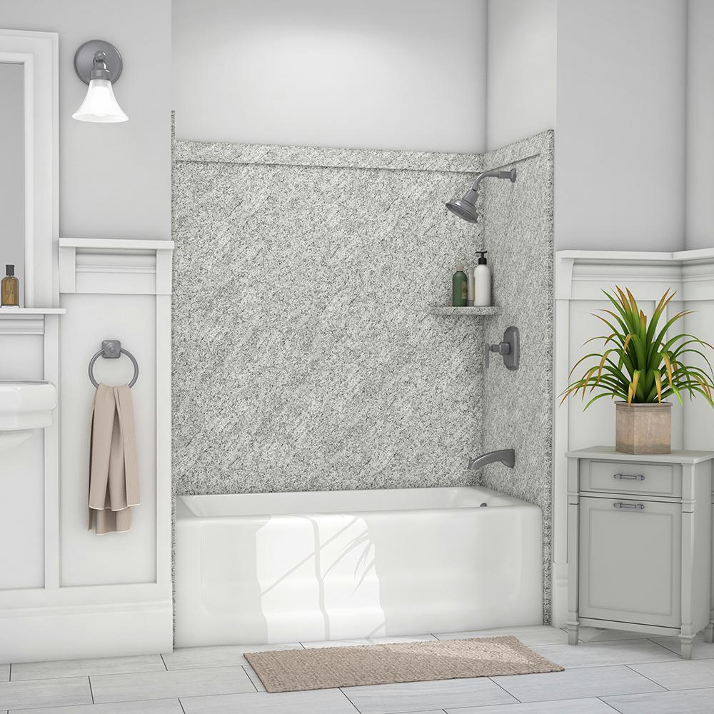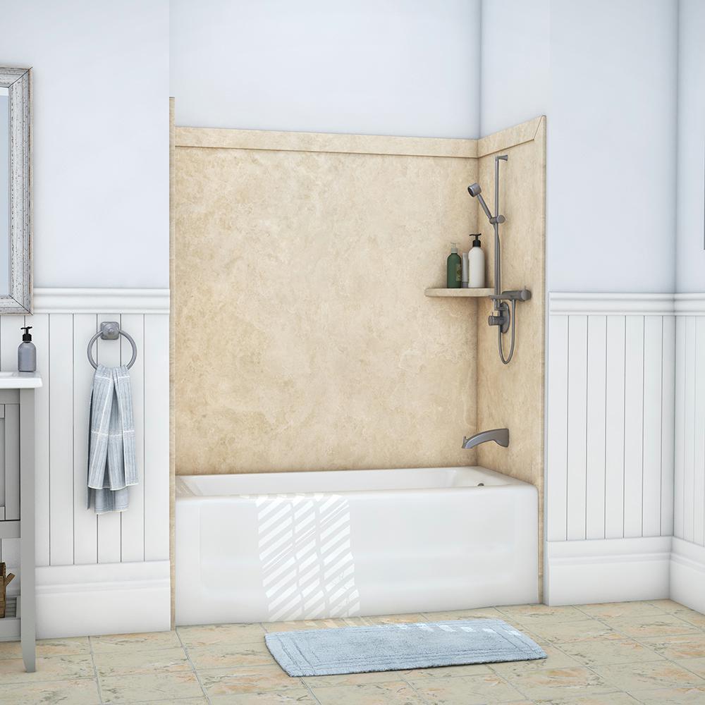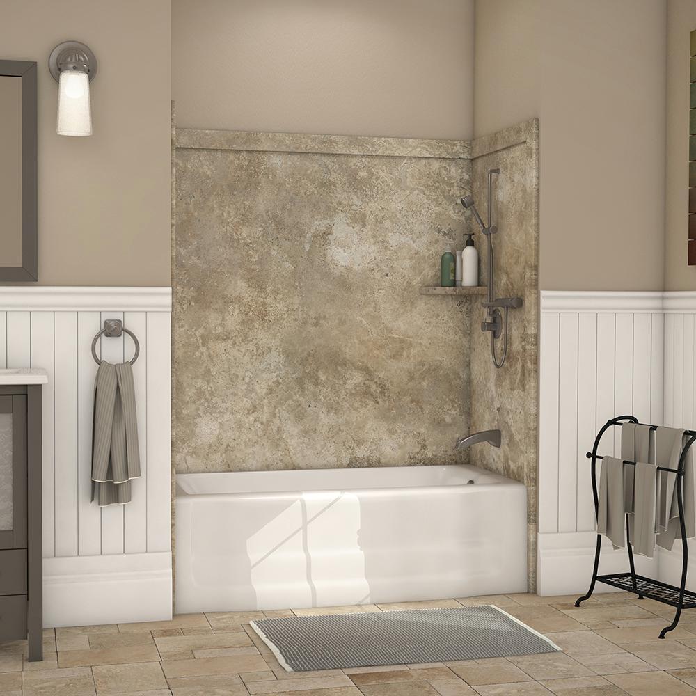 Surround yourself with the luxurious look of natural stone with FlexStone, the revolutionary tub and shower wall material that is easy to cut and install and easier still to clean and enjoy. The Elite Tub Surround Kit will fit openings up to 60 in. W x 32 in. D x 60 in. H and includes one 60 in. x 60 in. back wall panel, two 32 in. x 60 in. side panels, one 3 in. x 60 in. back wall trim, two 3 in. x 81 in. mitered side trim, two 3 in. x 34 in. mitered top trim, one corner shelf and corner reinforcements. The kit also includes specially-formulated adhesive to adhere FlexStone panels directly to sheetrock, cement board or other backer board material and color-matched silicone to finish all joints in the final step of installation.