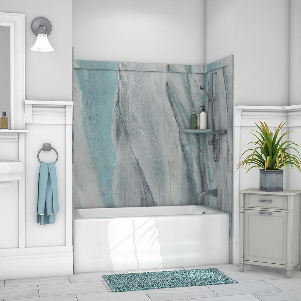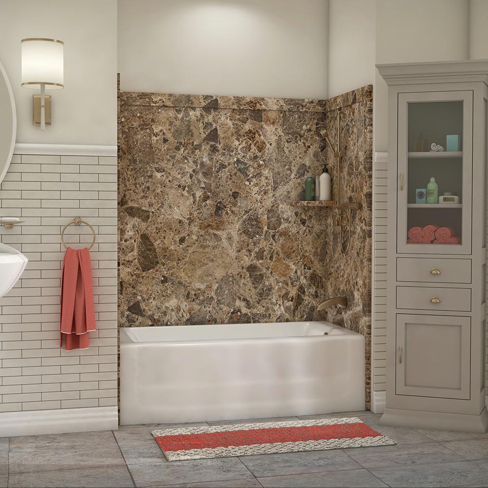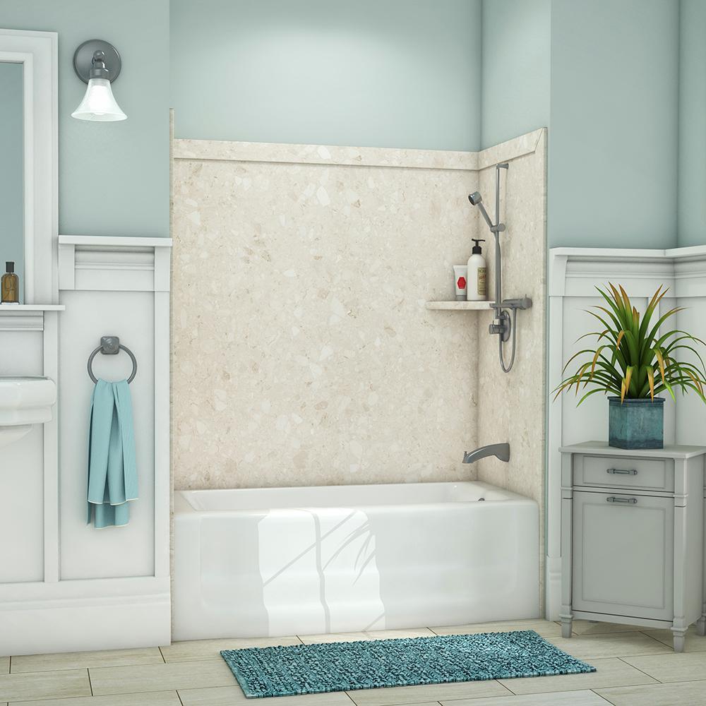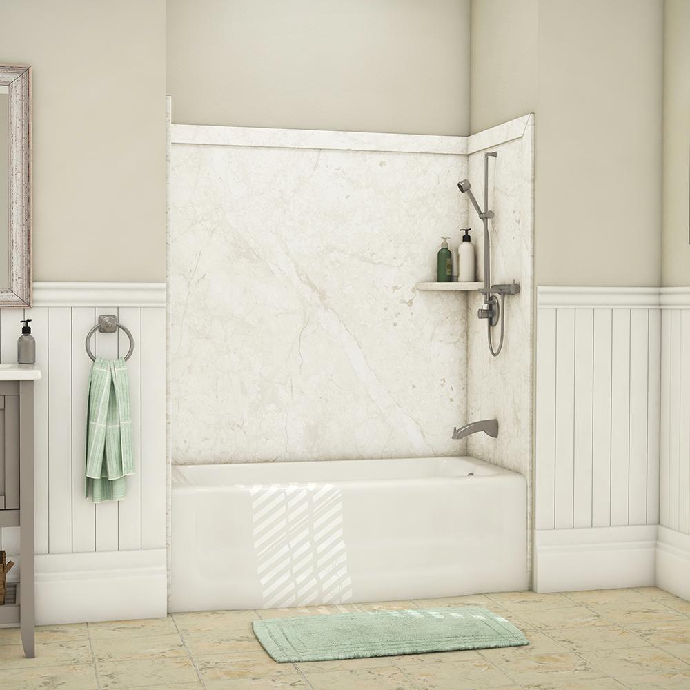 Surround yourself with the luxurious look of natural stone with FlexStone, the revolutionary tub and shower wall material that is easy to cut and install and easier still to clean and enjoy. The Elite Tub Surround Kit will fit openings up to 60 in. W x 32 in. D x 60 in. H and includes one 60 in. x 60 in. back wall panel, two 32 in. x 60 in. side panels, one 3 in. x 60 in. back wall trim, two 3 in. x 81 in. mitered side trim, two 3 in. x 34 in. mitered top trim, one corner shelf and corner reinforcements. The kit also includes specially-formulated adhesive to adhere FlexStone panels directly to sheetrock, cement board or other backer board material and color-matched silicone to finish all joints in the final step of installation.