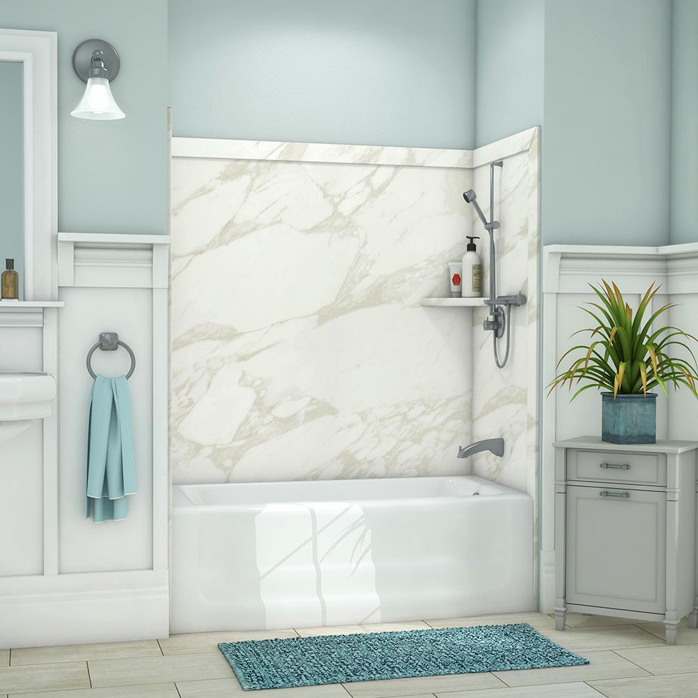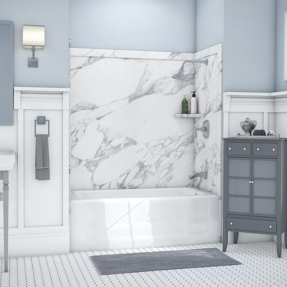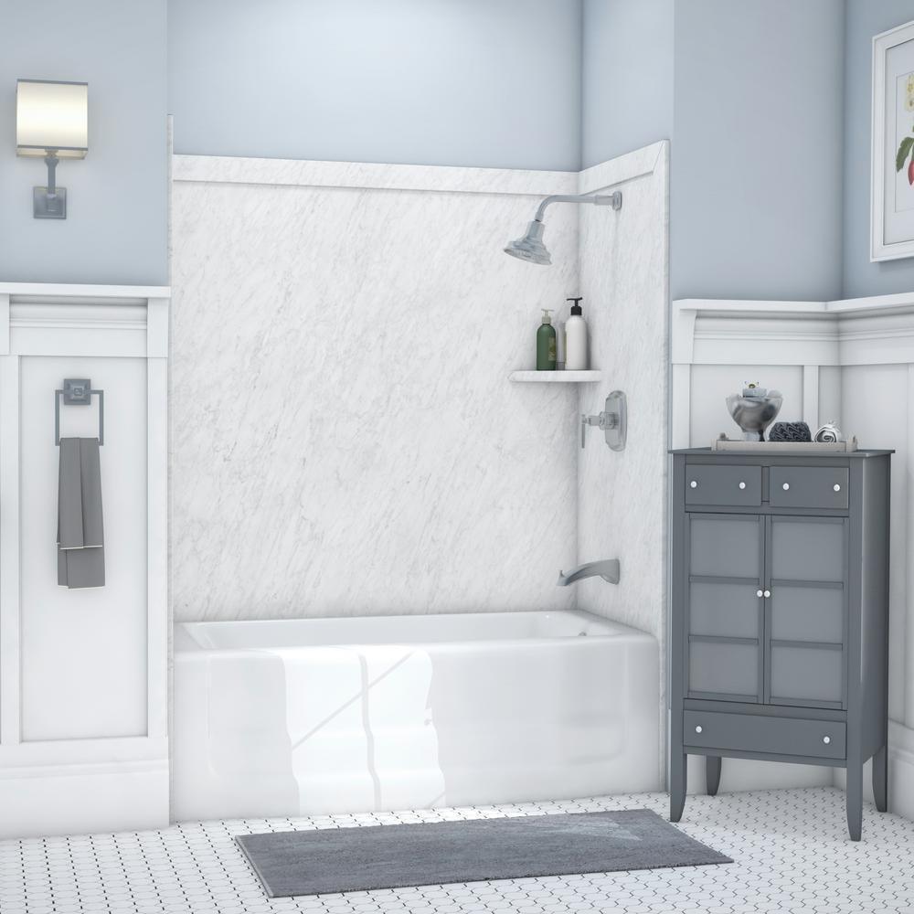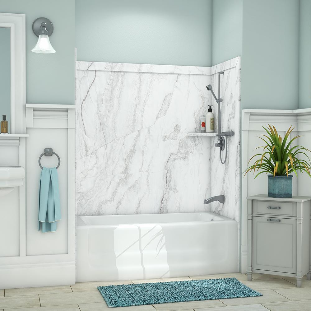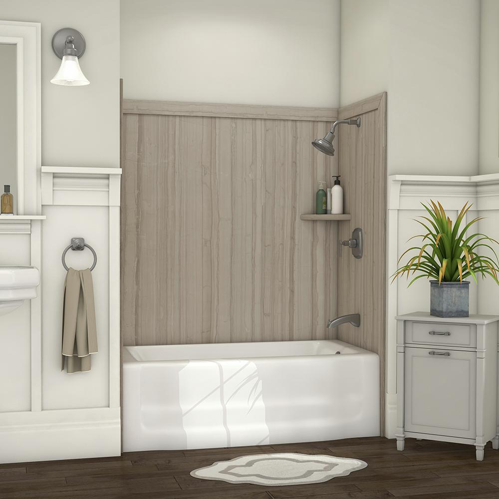 Surround yourself with the luxurious look of natural stone with FlexStone, the revolutionary tub and shower wall material that is easy to cut and install and easier still to clean and enjoy. The Elite Tub Surround Kit will fit openings up to 60 in. W x 32 in. D x 60 in. H and includes one 60 in. x 60 in. back wall panel, two 32 in. x 60 in. side panels, one 3 in. x 60 in. back wall trim, two 3 in. x 81 in. mitered side trim, two 3 in. x 34 in. mitered top trim, one corner shelf and corner reinforcements. The kit also includes specially-formulated adhesive to adhere FlexStone panels directly to sheetrock, cement board or other backer board material and color-matched silicone to finish all joints in the final step of installation.