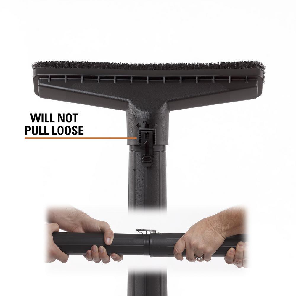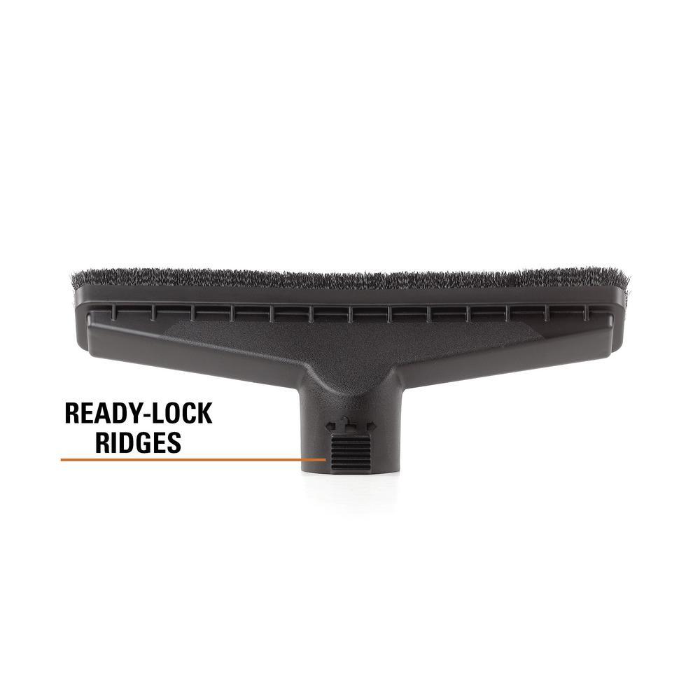 RIDGID 2-1/2 in. locking floor brush is great for general cleanup of hard surface floors. The large 14 in. brush effectively captures more dirt and debris in your path. With the new locking design, your accessory locks onto the hose or wand so it wont fall off during use. Easily detach by releasing the locking tab or twisting off. The 2-1/2 in. opening is the optimal size for tackling large messes with a RIDGID wet dry vac. Max your vac and get the most out of your cleaning tools, with RIDGID 2-1/2 in. locking accessories.