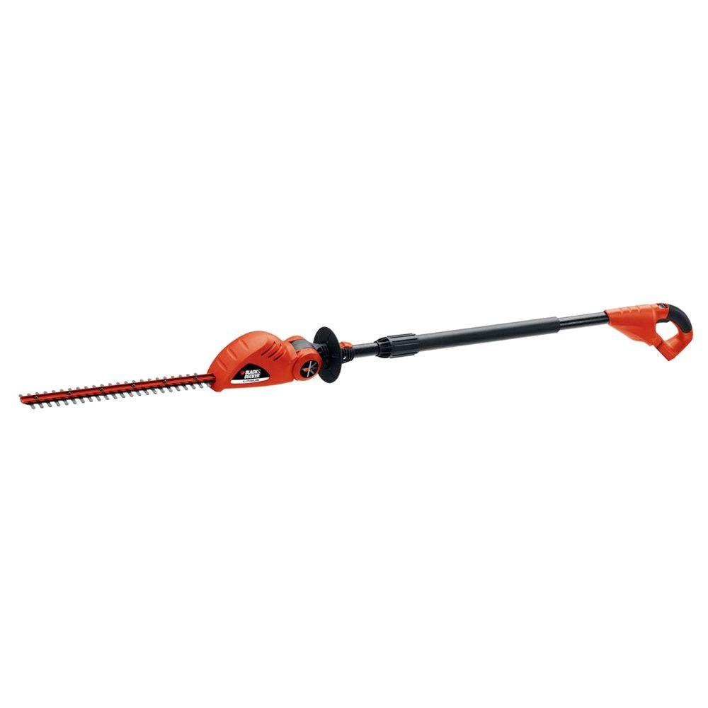 The black and decker LPHT120 22 in. 20-Volt Lithium-ion cordless pole hedge trimmer is perfect for those difficult, hard to reach hedges. The pole hedge trimmer has 180 pivoting head that adjusts and locks into 5 different positions for cutting high hedges. The LPHT120 has 18 in. dual action cutting blades with a 7/16 in. cut capacity. This unit is easy to store and only weighs about 7 lbs. For a limited time get a bonus 1.5Ah 20-Volt MAX Lithium-Ion Battery Pack with purchase.