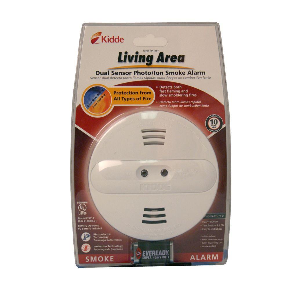 The Kidde PI9010 is a 9V battery powered Dual Sensor Smoke alarm. This smoke alarm functions as a single unit smoke alarm and features Hush, allowing you to quickly silence nuisance alarms. The PI9010 is easy to install, no wiring is required. This smoke alarm combines both photoelectric and ionization sensors. Ionization sensing alarms may detect invisible fire particles (associated with flaming fires) sooner than photoelectric alarms. Photoelectric sensing alarms may detect visible particles (associated with smoldering fires) sooner than ionization alarms. The Kidde PI9010, 9-Volt battery powered smoke alarms provides continuous protection against smoke and fire hazards even during power outages. The PI9010 also includes flashing LEDs to signal the alarm is functioning properly, a low battery warning and a loud 85dB alarm. The Kidde PI9010 is UL listed and offers a 10-year limited warranty.
