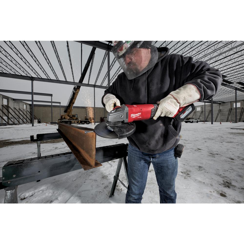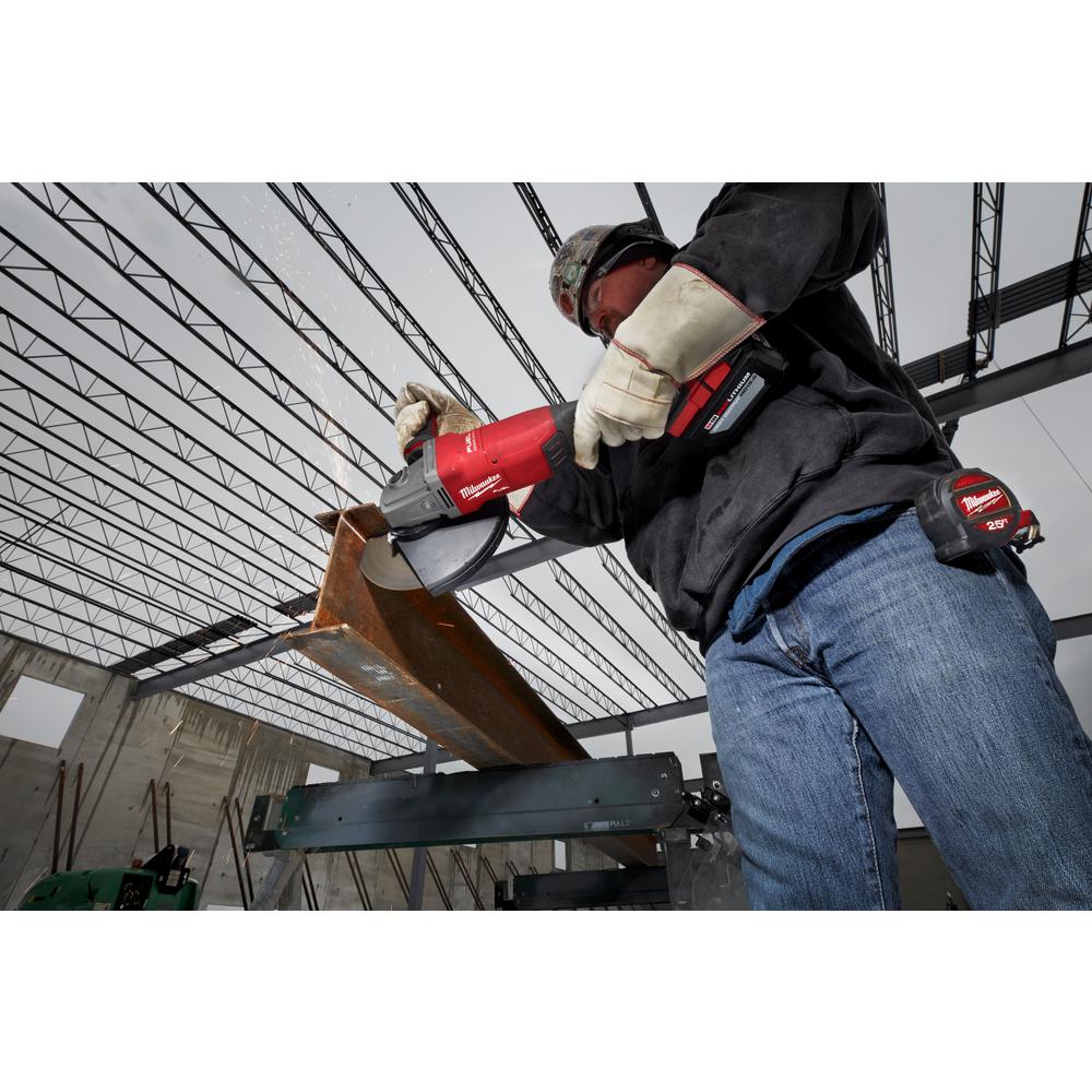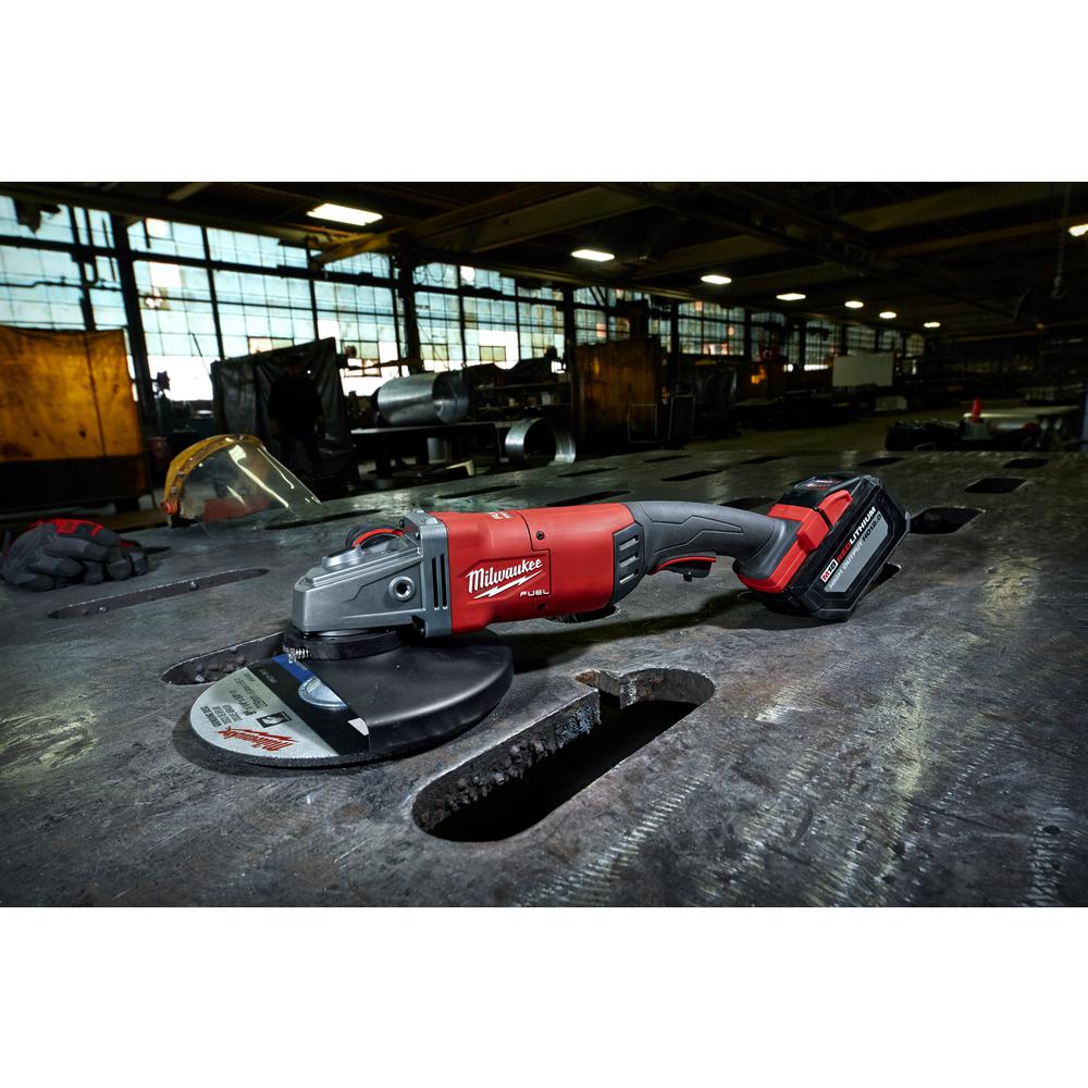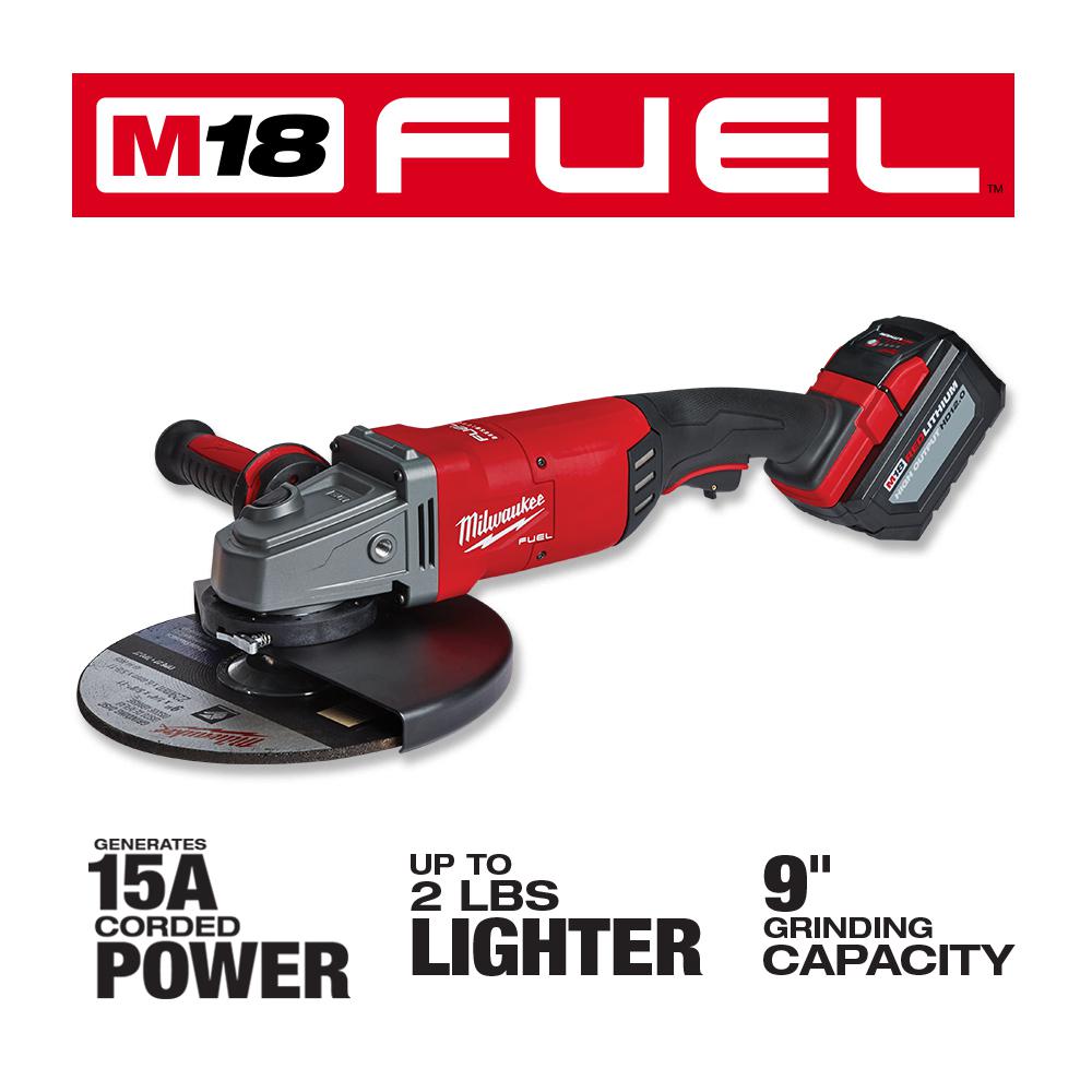 The Milwaukee M18 FUEL 7 / 9 in. Large Angle Grinder is the world’s first 18-Volt LAG capable of delivering the power of a 15Amp corded LAG. It is up to 2 lb. lighter than other models and has a 9” grinding capacity. Its high performance, advanced ergonomics & legendary durability ensures this grinder can tackle the toughest grinding, surface preparation, and cutting applications with any 7 / 9 in. accessory. The POWERSTATE Brushless Motor was purposely built for the M18 FUEL 7 / 9 in. Large Angle Grinder to provide the power and performance of a 15Amp corded large angle grinder. Built-in REDLINK PLUS Intelligence ensures optimal tool performance and provides overload protection to prevent damage to the tool and battery during heavy applications while still maintaining compatibility across the entire M18 System. The REDLITHIUM High Output HD12.0 Battery Pack provides 50% more power and runs 50% cooler versus standard REDLITHIUM HD packs. Superior pack construction provides the industry's best protection against jobsite conditions. In addition to the grinder, this kit comes with two REDLITHIUM High Output HD12.0 battery packs (48-11-1812), one M18/M12 multi-voltage rapid charger (48-59-1808), one 9 in. T27 guard, one dust vent clip, one FIXTEC nut, one backing flange, one spanner wrench, one anti-vibration handle, and a durable contractor bag.