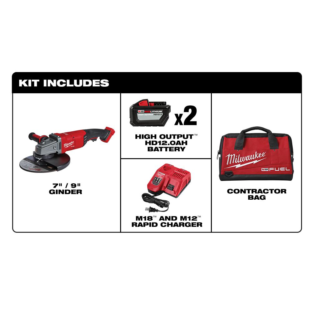 - Includes: 2785-20 7 in./9 in. large angle grinder, (2) M18 REDLITHIUM high output HD12.0 battery packs, M18 and M12 multi-voltage rapid charger, side handle, 9 in. type 27 grinding guard, fixtec nut, backing flange and spanner wrench