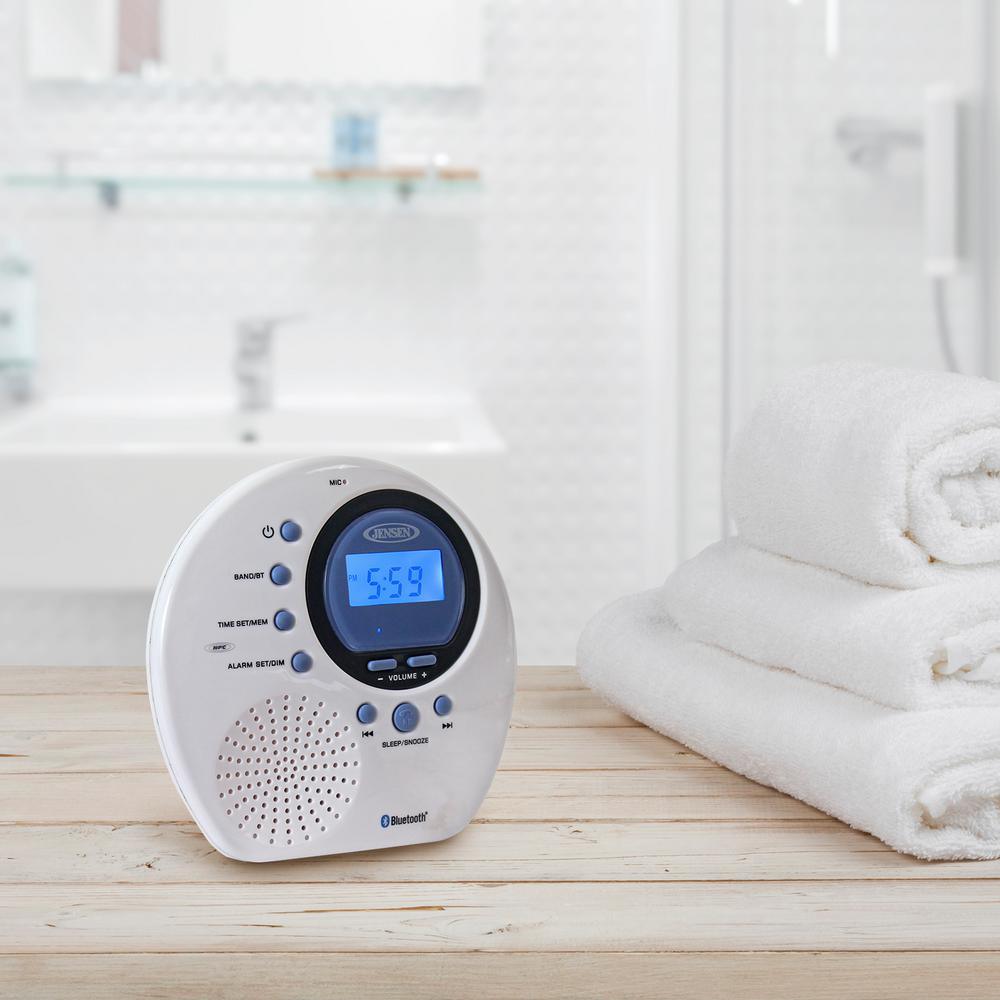 The JENSEN JWM-160 lets you tune in to your favorite radio station even while in the shower! This water-resistant digital AM/FM Bluetooth shower clock radio can be placed on a counter, hung from your shower head or attached to a curtain rod for easy access. The JWM-160 features Bluetooth connectivity, so you can stream music wirelessly from your Bluetooth enabled smartphone as well as take calls using the h and s-free speakerphone. The unit also features a built-in alarm clock with sleep, snooze and wake to radio or alarm functions. Also included is a blue back-lit LCD display, splash resistant cabinet and built-in antennas. The unit operates on 4 "AA" batteries (not included).