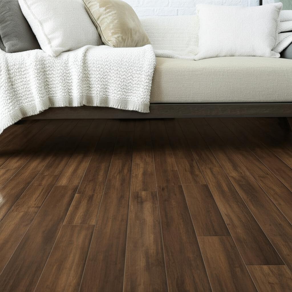 This hand-scraped bamboo flooring combines sustainable materials with a durable, scratch-resistant finish. Its sepia tones and beveled edges create a sophisticated look, while the click-lock mechanism ensures easy installation.