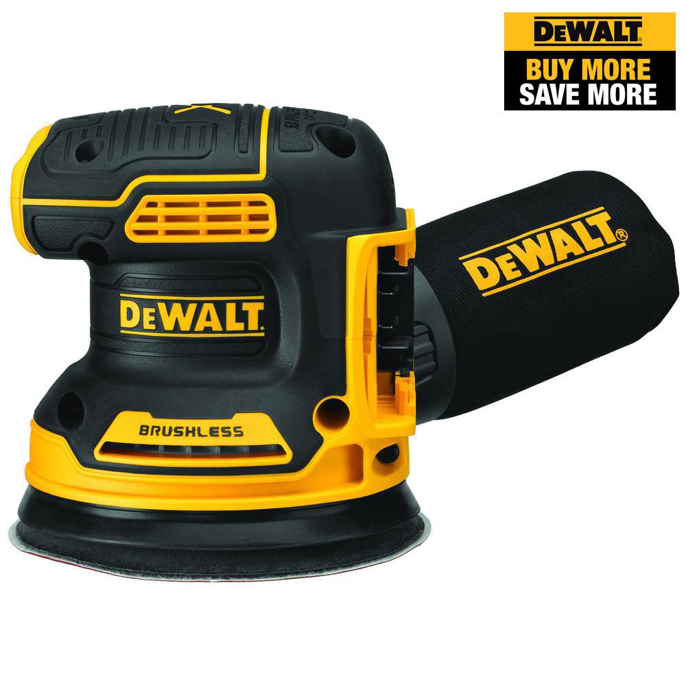 Our 20V MAX* XR Brushless 5 in. Cordless Random Orbital Sander provides you with the power and runtime needed to get the job done. A variable-speed dial provides ultimate speed control from 8,000 – 12,000 OPM for a variety of projects. One-handed locking dust bag attaches securely to the sander to aid in dust collection or the user can attach the sander directly to the DWV010 or DWV012 dust collectors. Rubber overmold grip provides comfortable sanding. Replacement 8-hole hook-and-loop sanding pad for quick, easy paper changing.