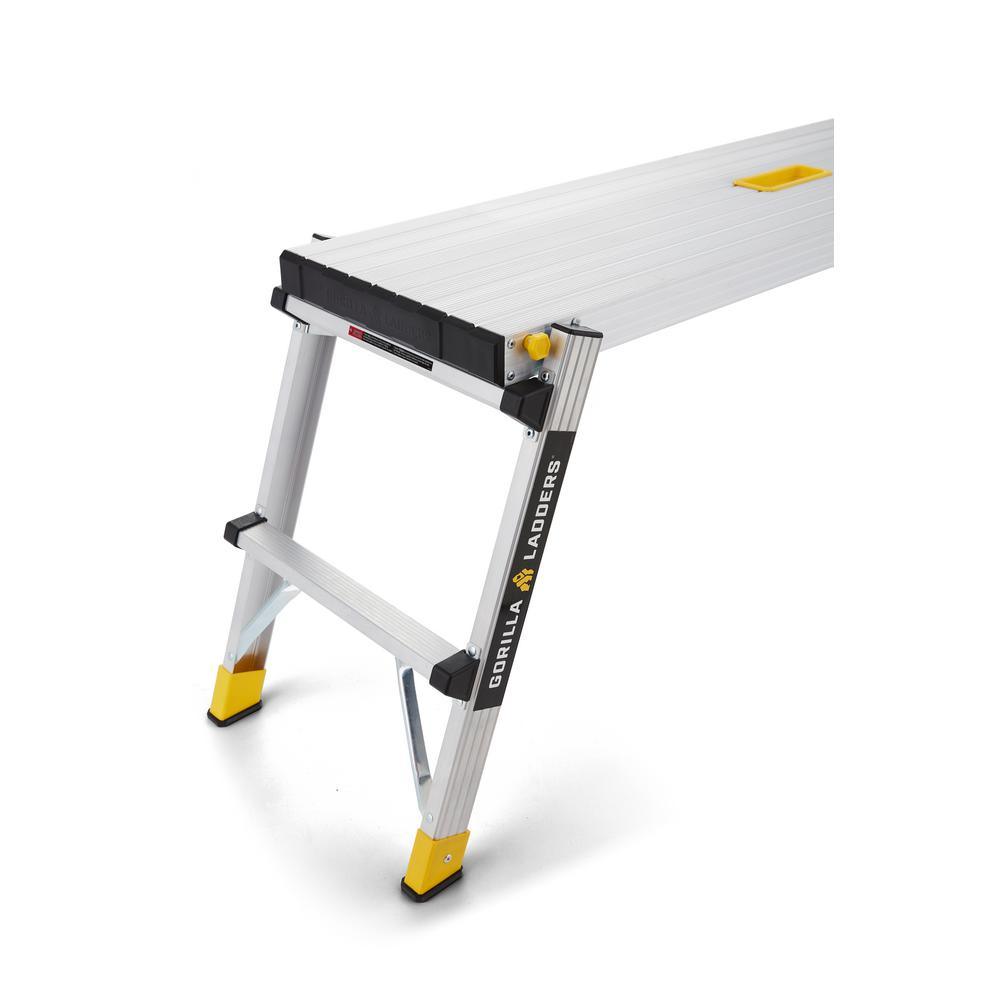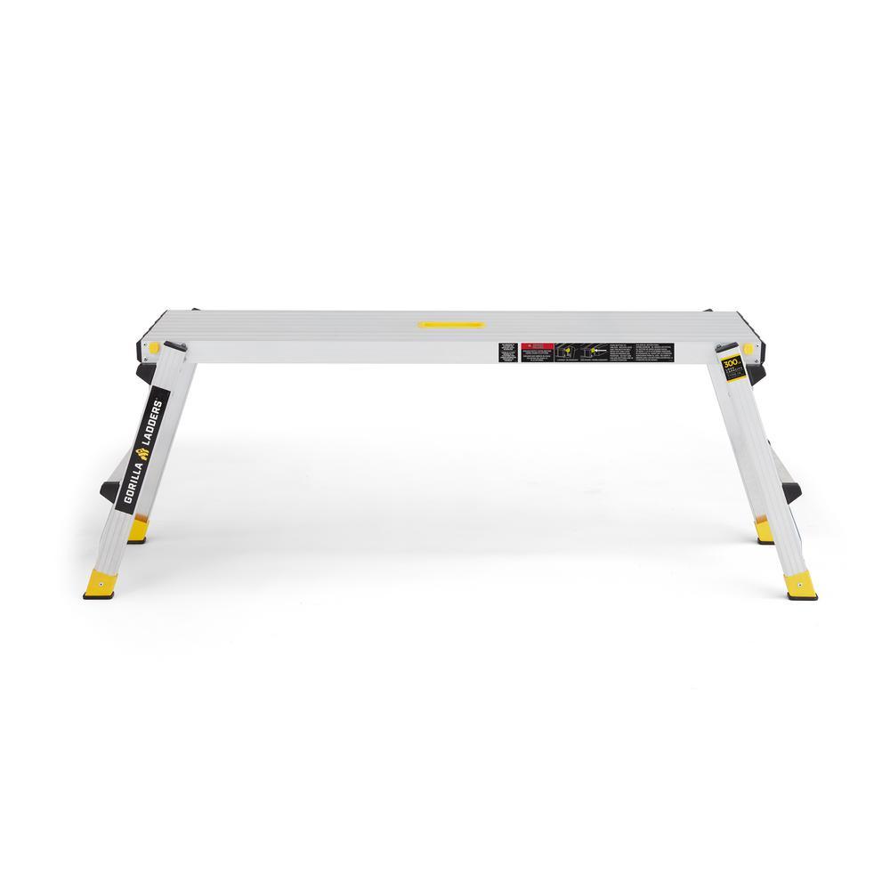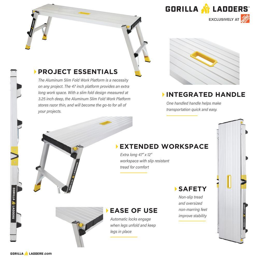 As an expert in the product and industry, I highly recommend the Gorilla Ladders 47.25 in. x 12 in. x 20 in. Aluminum Slim-Fold Work Platform, with a 300 lbs. load capacity. With a sturdy aluminum frame and non-marring feet, this platform offers a wide, non-slip standing area of 47.25 in. x 12 in. and an integrated handle for easy mobility. It can be used for various tasks such as painting, installing drywall, or as a work bench, and can be conveniently folded down to just 3.25 in. thick and weighs only 11 lbs. for effortless storage and transportation. Its 20 in. standing height is ideal for painting and drywall projects, and the slip-resistant surface ensures safety at all times.