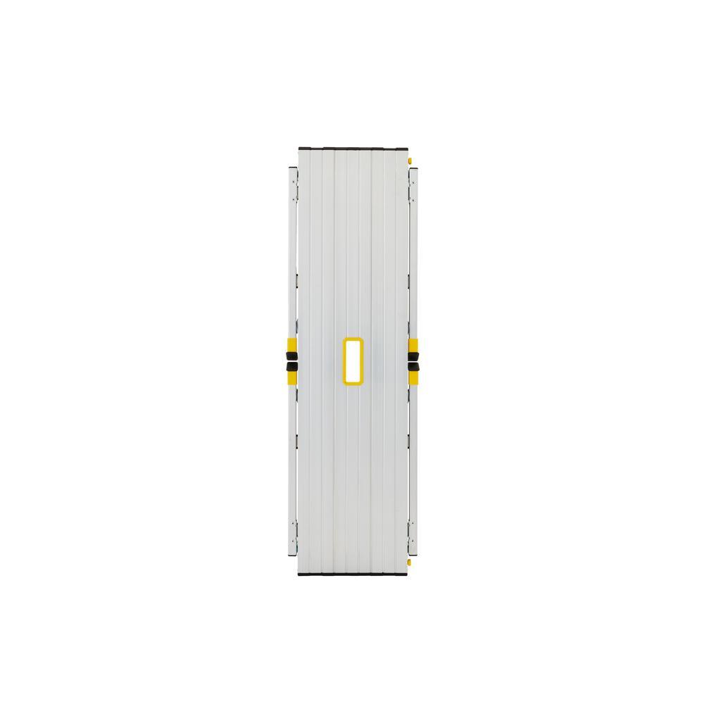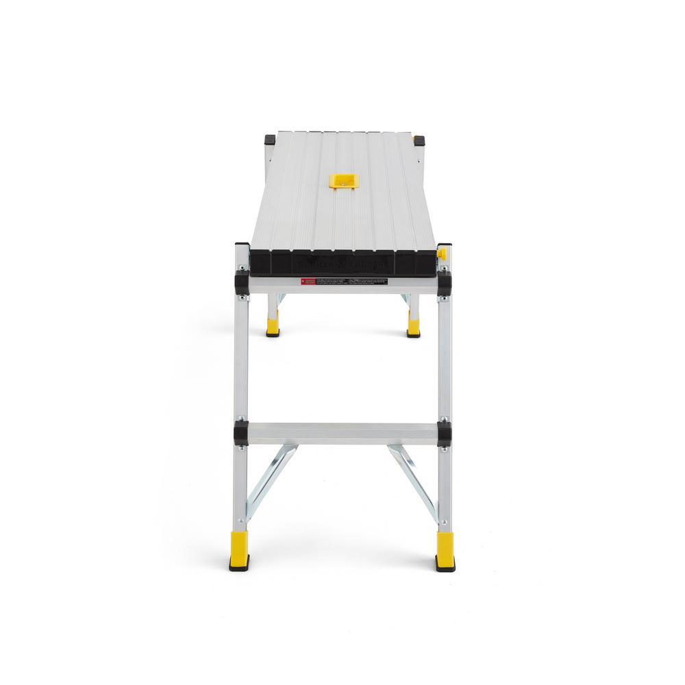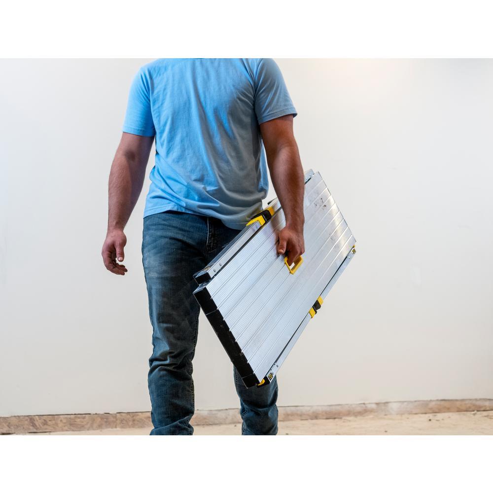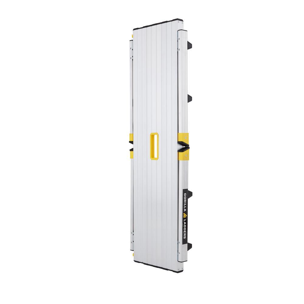 As an expert in the product and industry, I highly recommend the Gorilla Ladders 47.25 in. x 12 in. x 20 in. Aluminum Slim-Fold Work Platform, with a 300 lbs. load capacity. With a sturdy aluminum frame and non-marring feet, this platform offers a wide, non-slip standing area of 47.25 in. x 12 in. and an integrated handle for easy mobility. It can be used for various tasks such as painting, installing drywall, or as a work bench, and can be conveniently folded down to just 3.25 in. thick and weighs only 11 lbs. for effortless storage and transportation. Its 20 in. standing height is ideal for painting and drywall projects, and the slip-resistant surface ensures safety at all times.