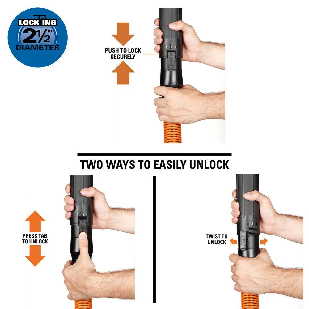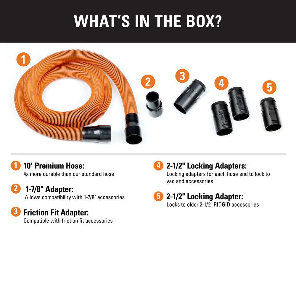 RIDGID's 1-7/8 in. Pro-Grade Locking Hose Kit extends up to 10 ft. for extra reach and is 4X more durable than standard RIDGID hoses. This hose is highly flexible while resisting collapsing. It fits all RIDGID 2-1/2 in. inlet configurations and includes 5 adapters for compatibility. With the new locking design, your hose locks onto both your vac and your wand or accessory, so nothing falls during use. Easily detach by releasing the locking tab or twisting off. The 2-1/2 in. diameter opening is the optimal size for tackling large messes with a RIDGID wet dry vac. Maximize your vac and get the most out of your cleaning tools with RIDGID's 2-1/2 in. locking accessories.