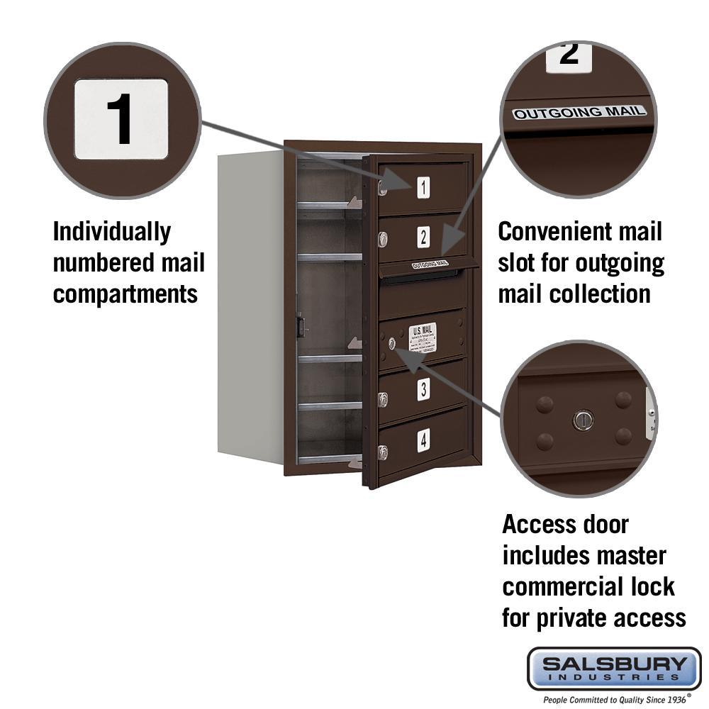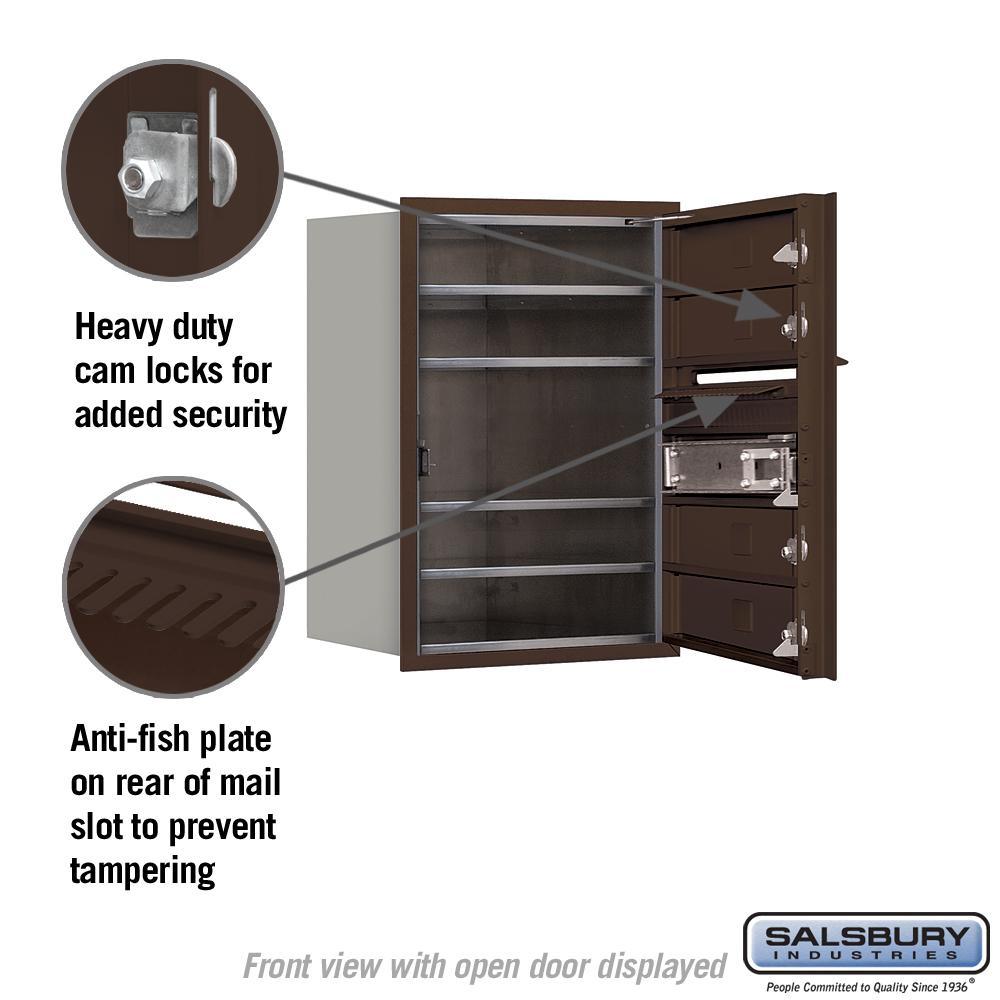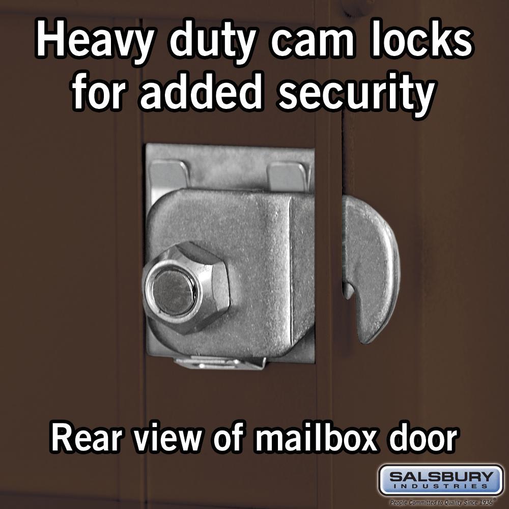 Constructed of heavy duty aluminum and stainless steel hardware, Salsbury 3700 series high security recessed mounted 4C mailboxes can be accessed from the front through one (1) easy opening master door panel. These units provide a convenient means of installing 4C horizontal mailboxes in locations where walls can accommodate a recessed mounted installation. The recessed mounted mailboxes are durable and corrosion resistant that can be used indoors or outdoors and feature a powder coated finish in aluminum, bronze, gold and sandstone. All mailbox doors include a heavy-duty cam lock with a dust/rain shield and includes three (3) keys. The outgoing mail compartment includes a weather protection flap, mail slot and carrier access door, which includes master commercial locks with two (2) keys for private access, and anti-fish plate on rear of mail slot to prevent tampering of outgoing mail. Ideal when private centralized mail delivery is desired for apartments, condominiums, commercial buildings, residential developments, colleges, schools, private postal centers, corporate mail centers, military bases, government agencies and many other applications. For U.S.P.S. delivery of mail, contact your local postmaster for approval. Salsbury Industries is an ISO 9001: 2008 certified company and has excelled in the field of manufacturing since 1936.