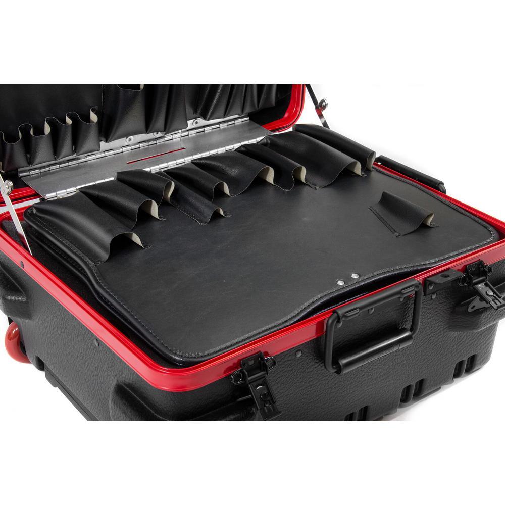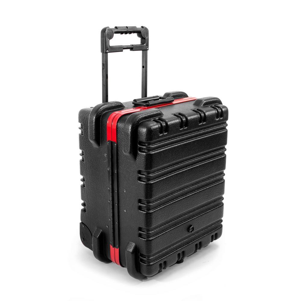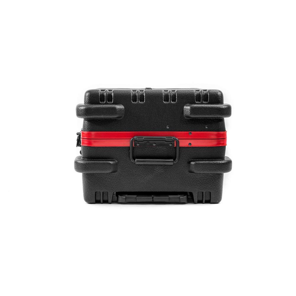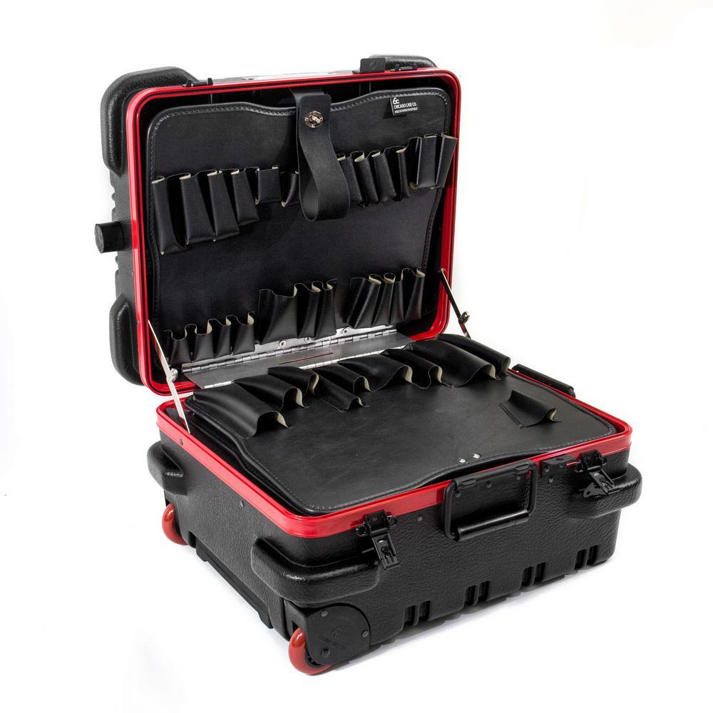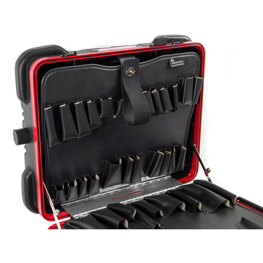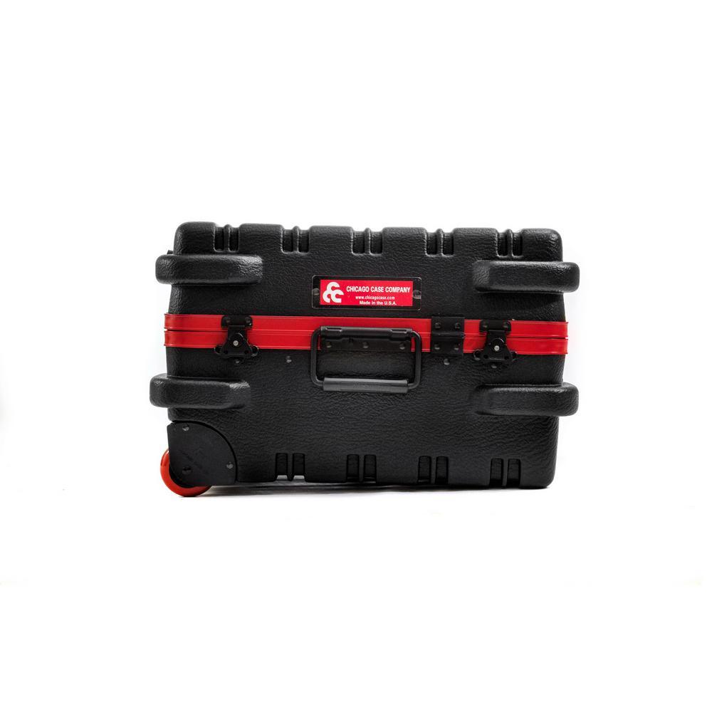 This Chicago Case Military-style tool case with high-impact black polyethylene plastic, 25% thicker than our standard cases. This case has an aluminum tongue-in-groove frame to resist dirt and moisture and features 8 external protective bumpers. The case includes our unique V-hinged top pallet with bottom pallet to hold more than 50 tools (not included), a 3-digit TSA approved combination lock and plank foam in the base. Tool case capacity is approximately 70 lbs. to 75 lbs. This case is part of our Red Line Premium Military-Style Tool Case line and comes with a red tongue-in-groove frame and red wheels. Features 8 protective external bumpers Mechanical lid stays to keep lid from falling 2 Butterfly latches Full piano hinge Tray rests and turnbuckle strap for included tool pallets Room in Base for optional items V-hinged Tool Pallet Set to hold more than 60 tools (not included) TSA-approved 3 digit combination lock.