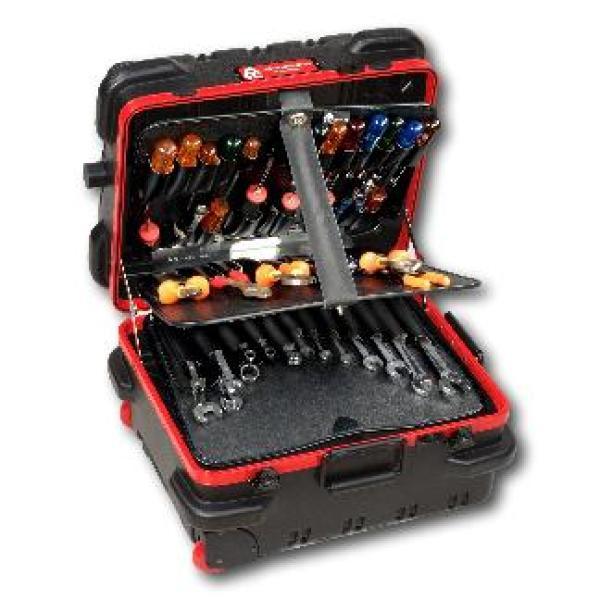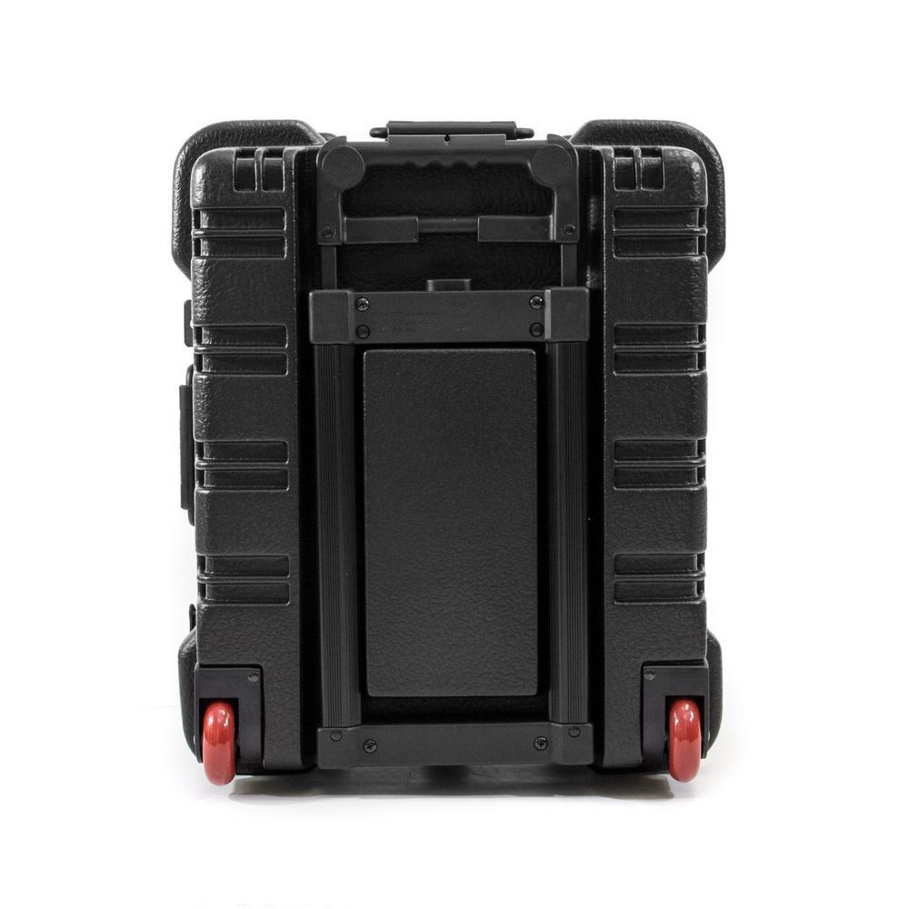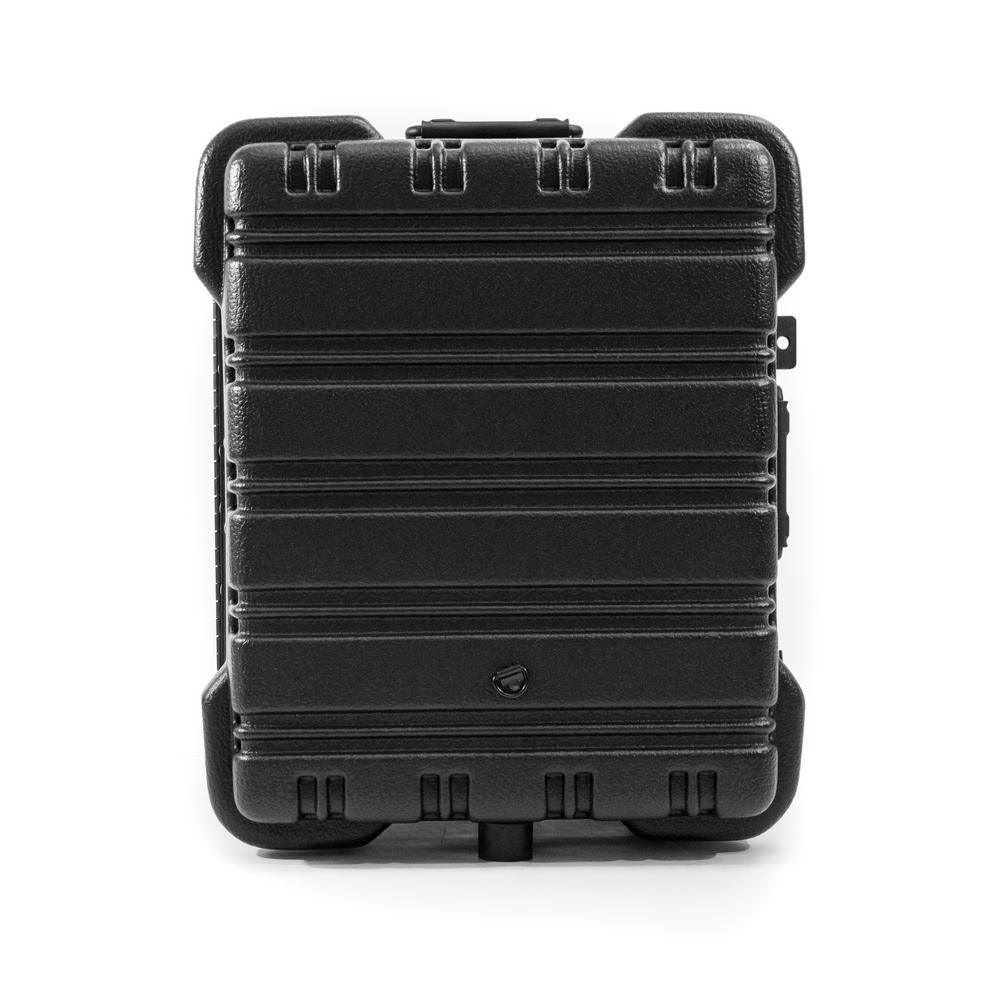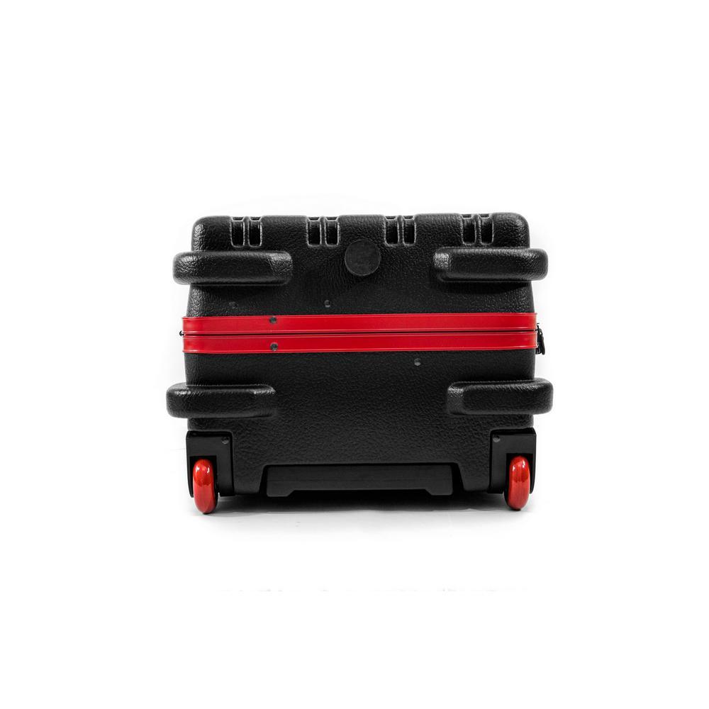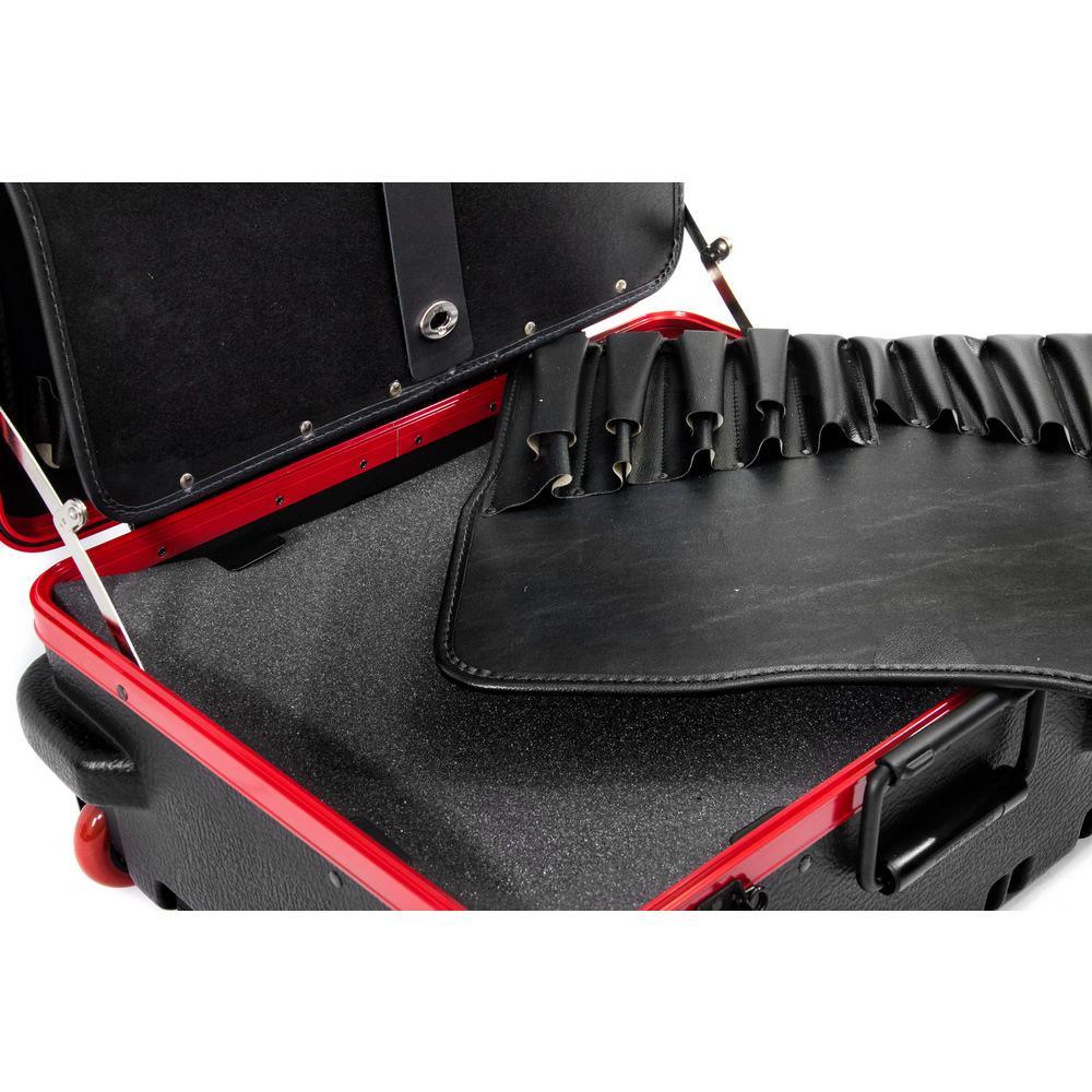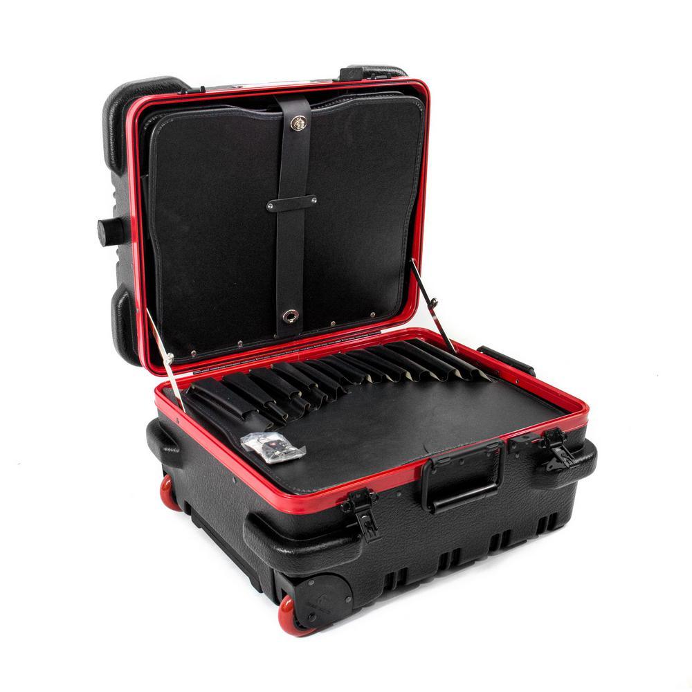 This Chicago Case Military-style tool case with high-impact black polyethylene plastic, 25% thicker than our standard cases. This case has an aluminum tongue-in-groove frame to resist dirt and moisture and features 8 external protective bumpers. The case includes our unique V-hinged top pallet with bottom pallet to hold more than 50 tools (not included), a 3-digit TSA approved combination lock and plank foam in the base. Tool case capacity is approximately 70 lbs. to 75 lbs. This case is part of our Red Line Premium Military-Style Tool Case line and comes with a red tongue-in-groove frame and red wheels. Features 8 protective external bumpers Mechanical lid stays to keep lid from falling 2 Butterfly latches Full piano hinge Tray rests and turnbuckle strap for included tool pallets Room in Base for optional items V-hinged Tool Pallet Set to hold more than 60 tools (not included) TSA-approved 3 digit combination lock.
