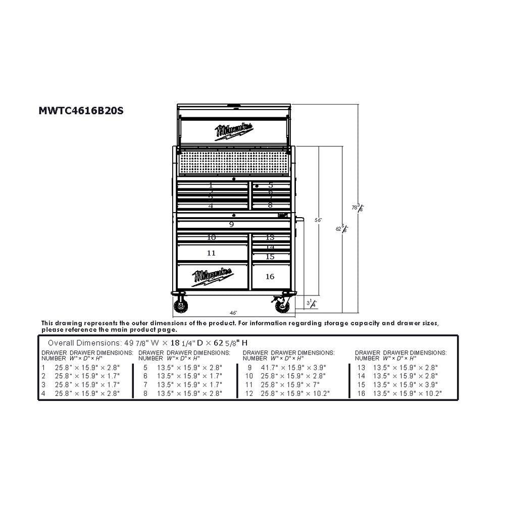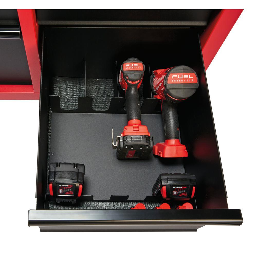 Keep your workshop clean with the Milwaukee 46 in. 16-Drawer Tool Chest and Cabinet Set in Red. Designed for both hobbyists and professional craftsmen, it is built with a heavy-duty 20-Gauge all-welded steel construction to offer increased durability. This tool storage system has a textured powder coat paint finish to increase resistance to corrosion, weather and staining. It is designed with a lid that features gas struts for improved safety when opening and closing. It has a shelf and a tray, allowing for complete customization of your garage organization system. This Milwaukee tool cabinet is designed with 16-drawers, 7 small, 6 medium and 3 large and features a total holding capacity of 27223 cu. in. providing the perfect storage solution for all of your equipment. Excellent for smooth operation, it is made with ball bearing slides that can hold up to 100 lbs. to accommodate heavy loads. This tool storage system comes with a computer drawer which provides a secure place to hold your laptop while you are working and slides away to safely store it while not in use. Ideal for keeping your tools secure, it is made with a 3-barrel key locking system so it will offer you peace of mind. This Milwaukee tool cabinet utilizes polypropylene fixed and swivel casters that can support up to 1800 lbs. and has 3 rounded tubular handles, making it easy to maneuver around.