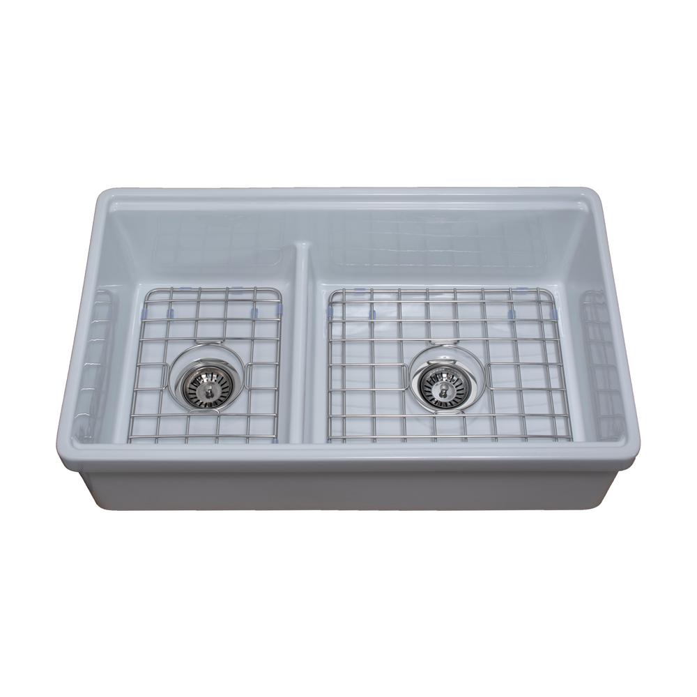 Tosca Farmhouse Fireclay 33 in. 60/40 Double Bowl Kitchen Sink in White with Cutting-Board, Bottom Grid and Strainer