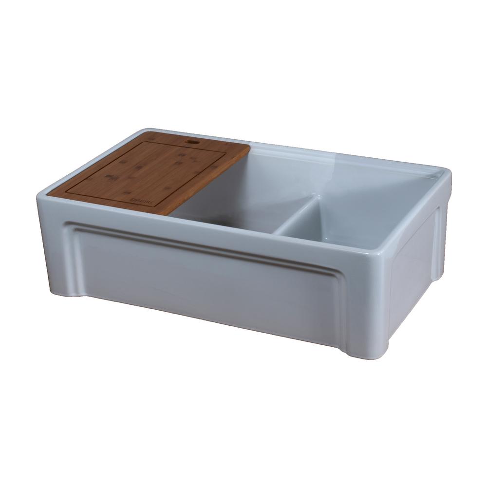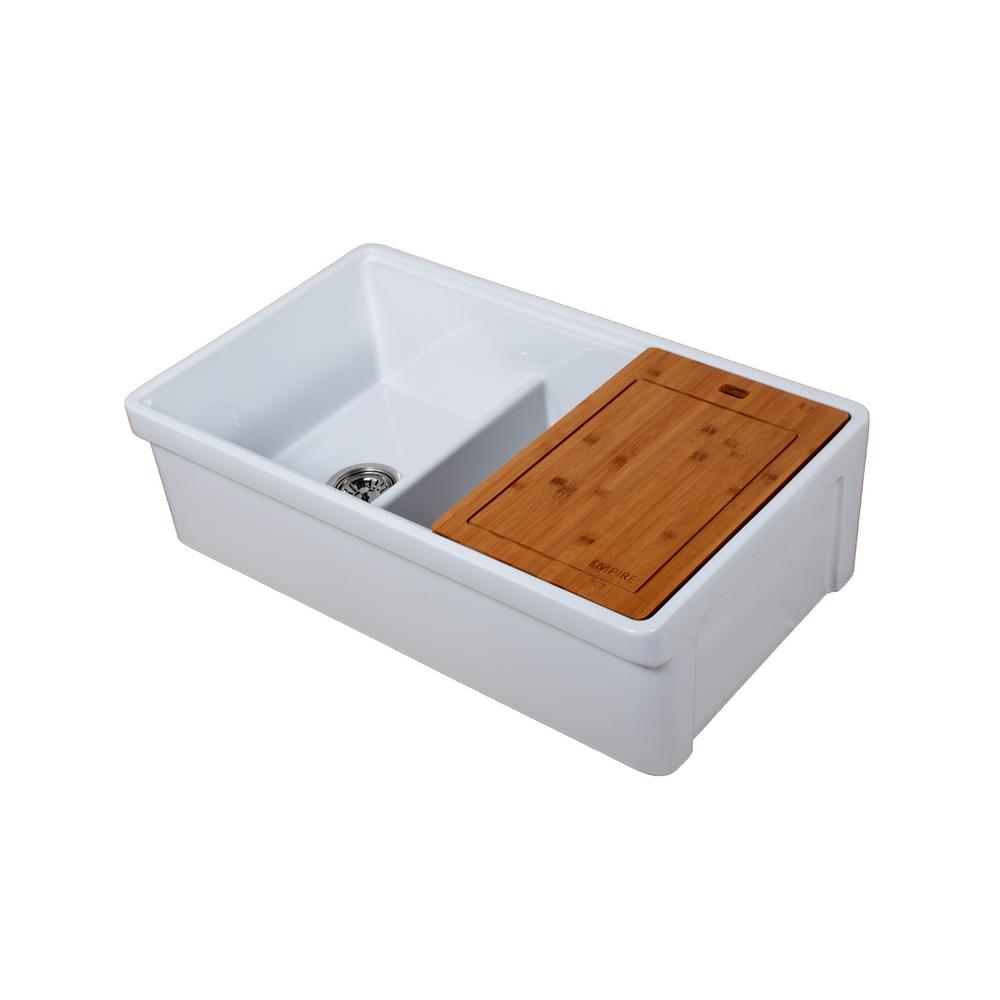 The Empire TOSCA Fireclay Farmhouse Kitchen Sink is a remarkable workstation; traditional style with a modern twist that is totally unique. It features apron front installation, a popular option in kitchen renovations. Masterfully handcrafted in Italy from authentic fine fireclay, and featuring an innovative integrated accessory ledge, the Empire Tosca is durable, beautiful and versatile. The accessory ledge is built so custom accessories will fit within the sink to better utilize space and simplify food preparation. The sliding cutting board and drying dish rack offer incredible practicality and ease of use. The TOSCAs versatility does not end there; with a reversible apron front, Top-Lip or Casement (Beveled Arch) style, the Tosca kitchen sinks will surely complement any decor, from contemporary to traditional or transitional. Fireclay sinks start with artisan hand-finishing techniques, and are fired at temperatures above 2,100F, making them ultra-durable, stain and chip-resistant. The materials and process allows for a perfect, smooth and easy to clean surface.