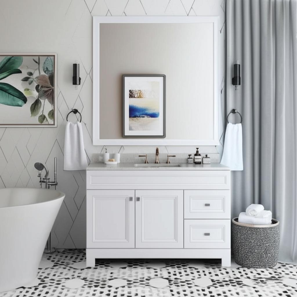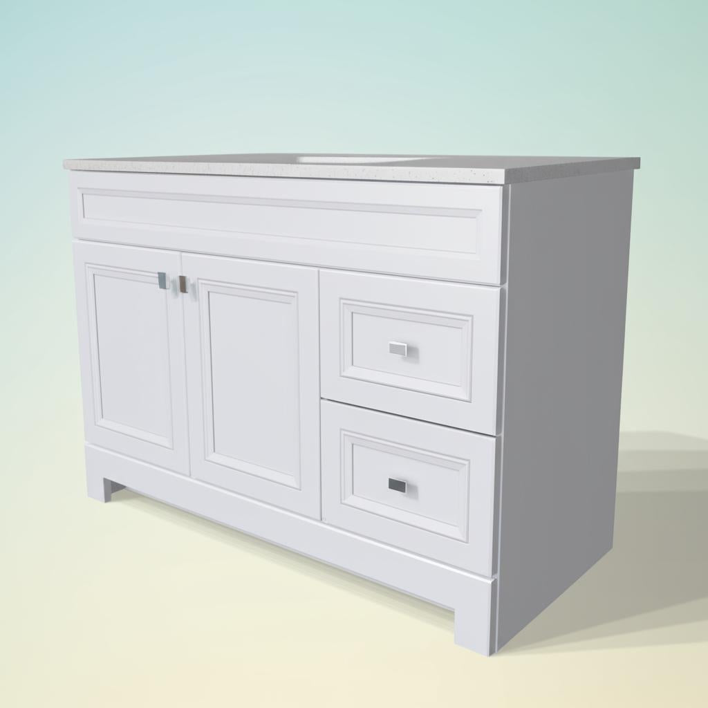 The Sedgewood 48.5-inch Bathroom Vanity combines timeless design with modern functionality. Featuring a durable Arctic solid surface top and integral white sink, it offers customizable storage and a polished finish for any bathroom.