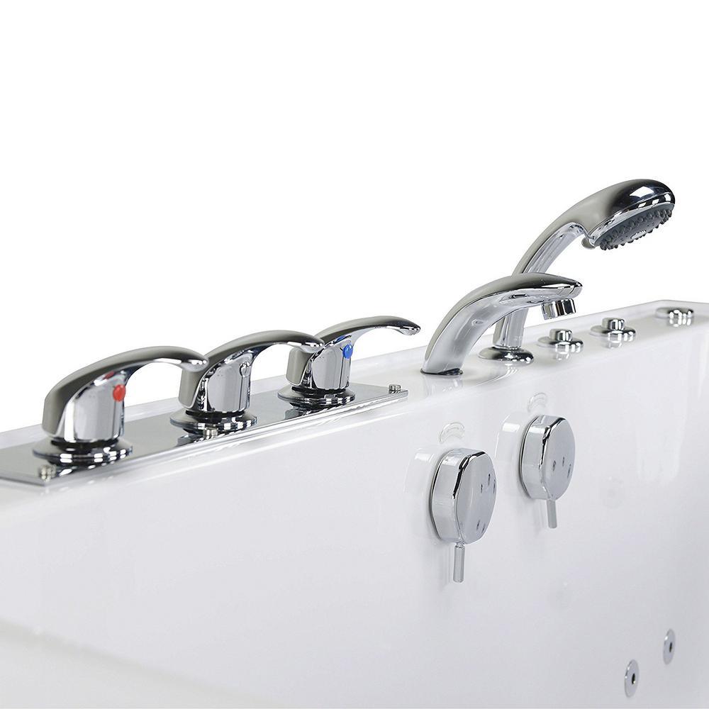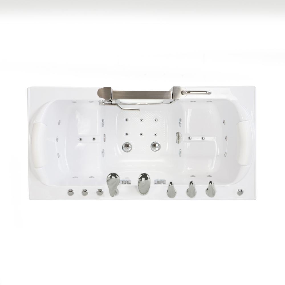 The Ella Companion Walk-in Bathtub is the perfect walk in tub to share with your significant other. Its a longer bathtub which allows for two seats to make for a relaxing comfortable experience with your companion. This unique two-seat walk in bathtub has two 20 seats and features a removable rubber backrest. The Ella Companion has textured slip resistant floor and a low step threshold for easy access. In addition, 2 drain minimizes the amount of time you have to sit outside of water. These drains are gravity driven and are larger than a standard one and half inch drain. This allows the walk-in bathtub to drain in approximately 80 seconds at ideal plumbing conditions. Ella acrylic baths are built to last starting with a high gloss acrylic shell which is easy to clean, scratch resistant and impermeable to mold and bacteria. The shell is fiberglass reinforced and supported with frame and multiple leveling legs. By utilizing the interchangeable end access panel, your Ella Walk-In Bath can easily be installed into a corner or alcove setting. The removable door allows easier access to clean hard to reach places. So, the door is not only stylish but also functional. All these unique features and user-friendly controls put the finishing touch on this relaxing and therapeutic bathing experience. Available in many options, Whirlpool, Air, MicroBubble, Dual Massage, Heated Seat and Backrest