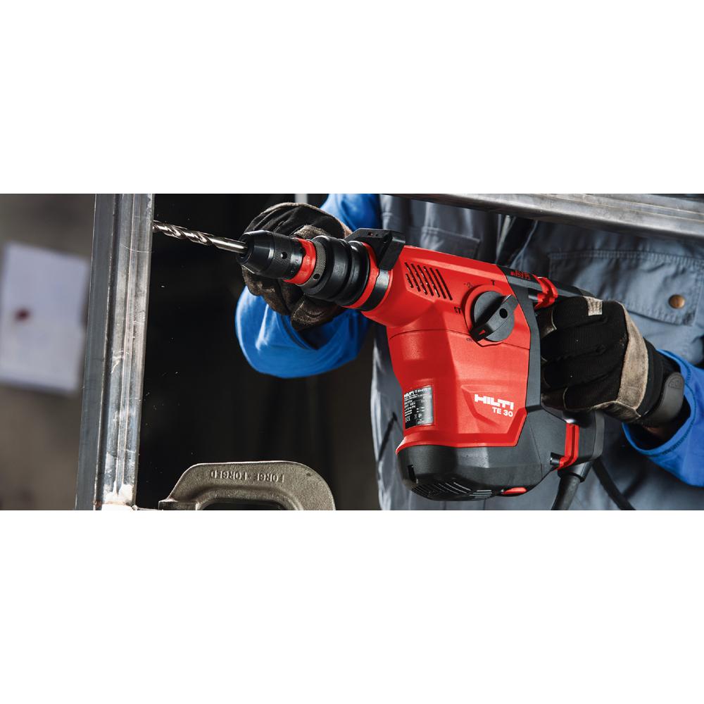 The new Hilti 120-Volt 8.6 Amp 1-1/8 in. SDS plus TE 30 Active Vibration Reduction (AVR) rotary hammer drill with active vibration reduction delivers impressive drilling performance without a lot of weight. At just 9 lbs. the TE 30 keeps you drilling non-stop at various drilling orientations with minimal effort overhead or at shoulder level. The remarkable vibration control and a chiseling function will increase daily productivity. Delivering 4500 impacts per minute with an impressive power-to-weight ratio. With 1100 RPM the TE 30 AVR rotary hammer is quickly becoming a pros tool of choice. Add the TE (DRS) dust removal system for virtually dust-free drilling. Applications include chiseling in brick and block, corrective chiseling and surface finishing on concrete.
