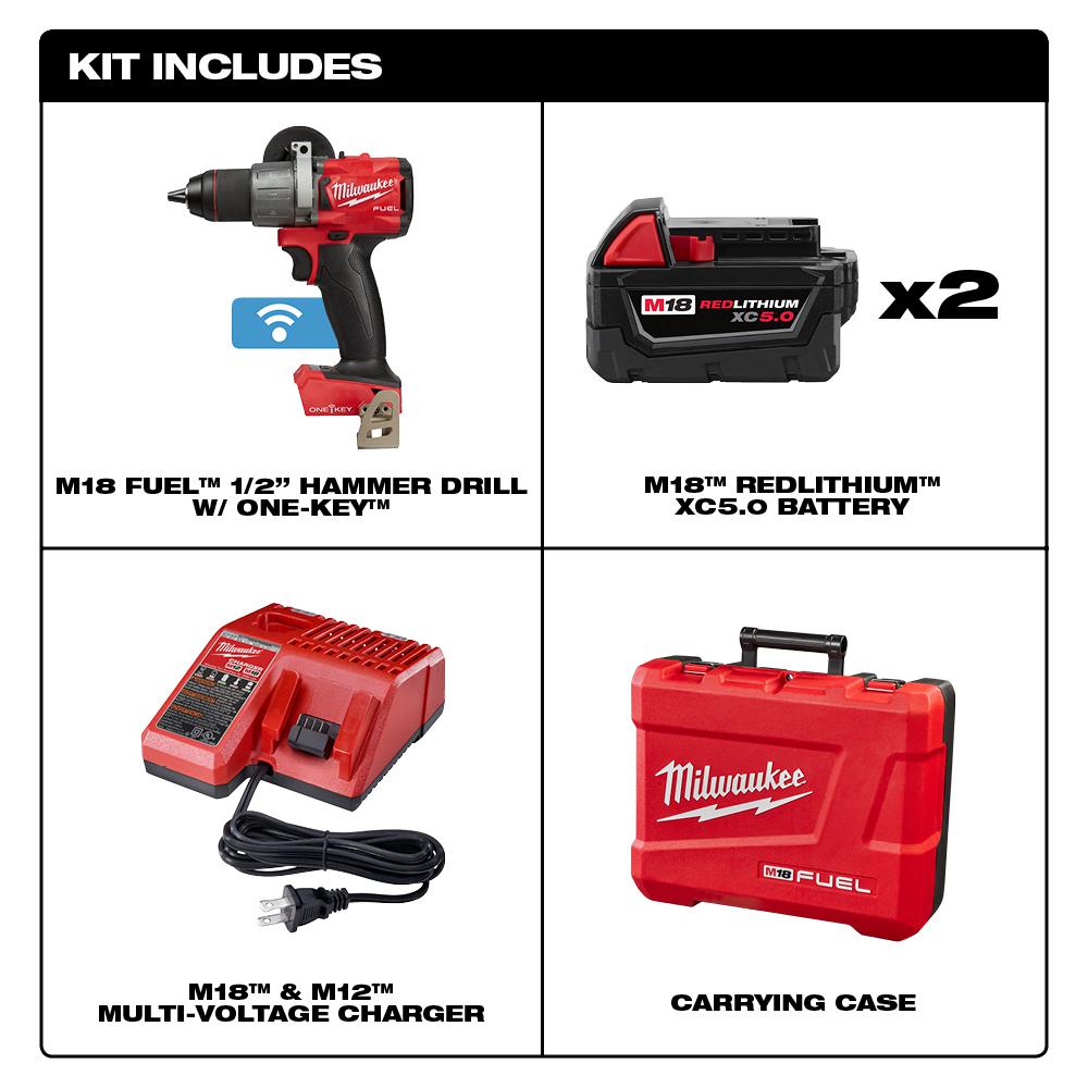 - Includes: M18 FUEL 1/2" Hammer Drill w/ ONE-KEY (Tool Only) (2806-20), (2) M18 REDLITHIUM XC5.0 Batteries, (1) M18 & M12 Multi-Voltage Charger, Side Handle, Belt Clip, Bit Holder