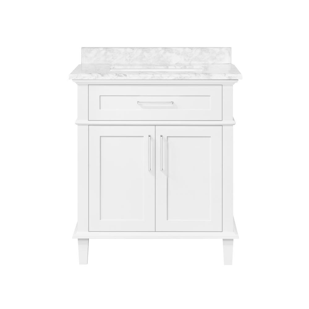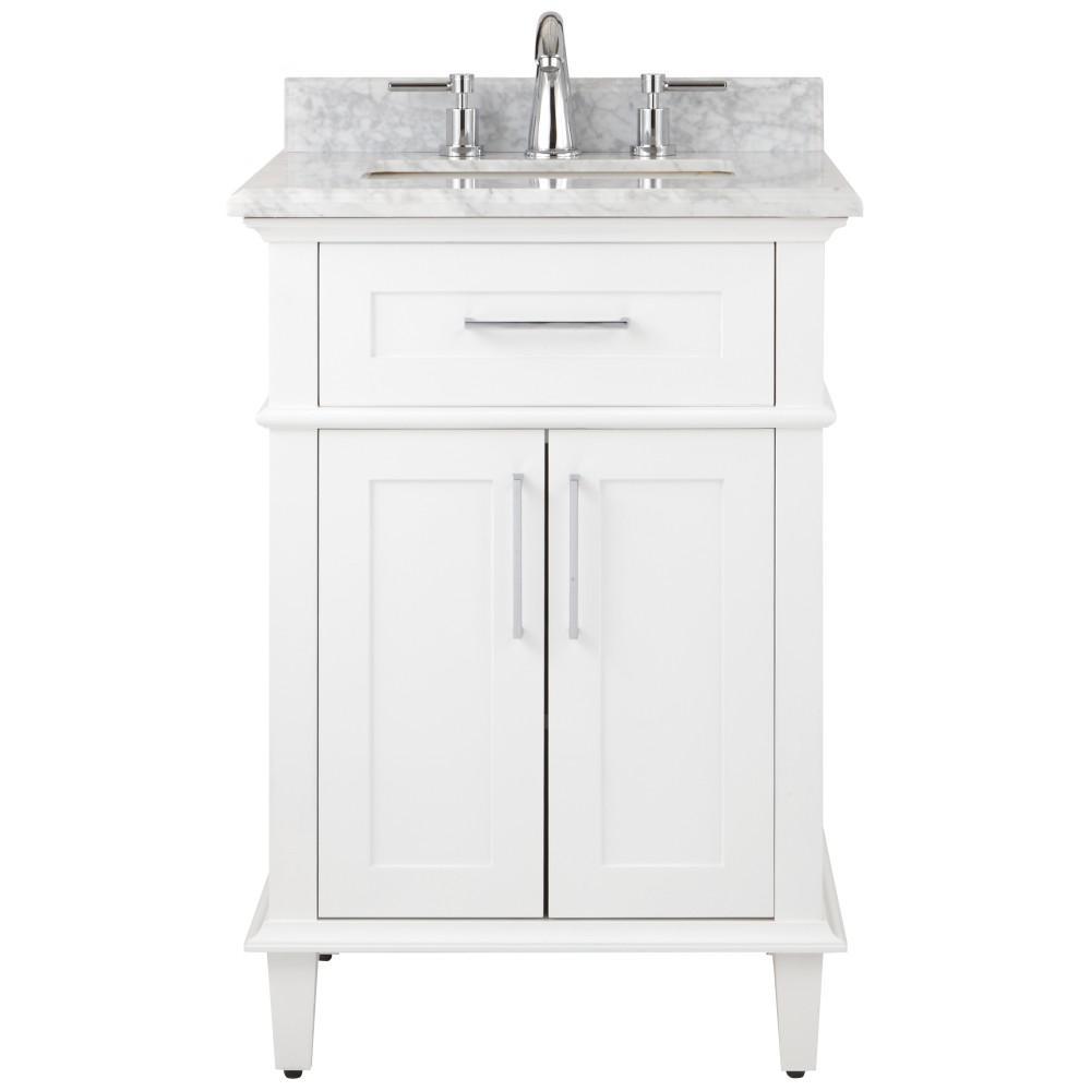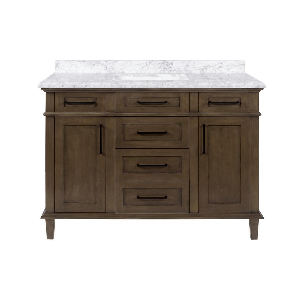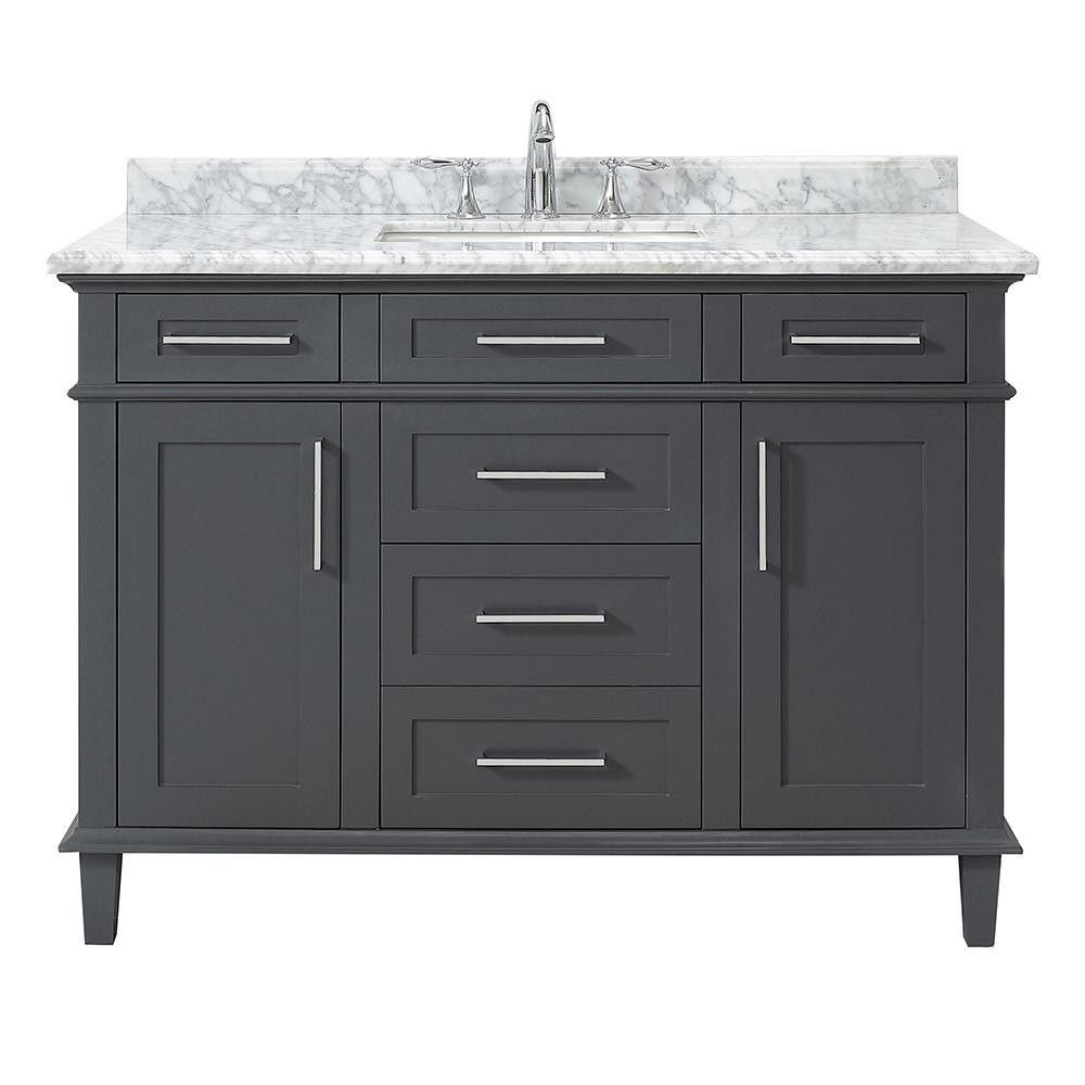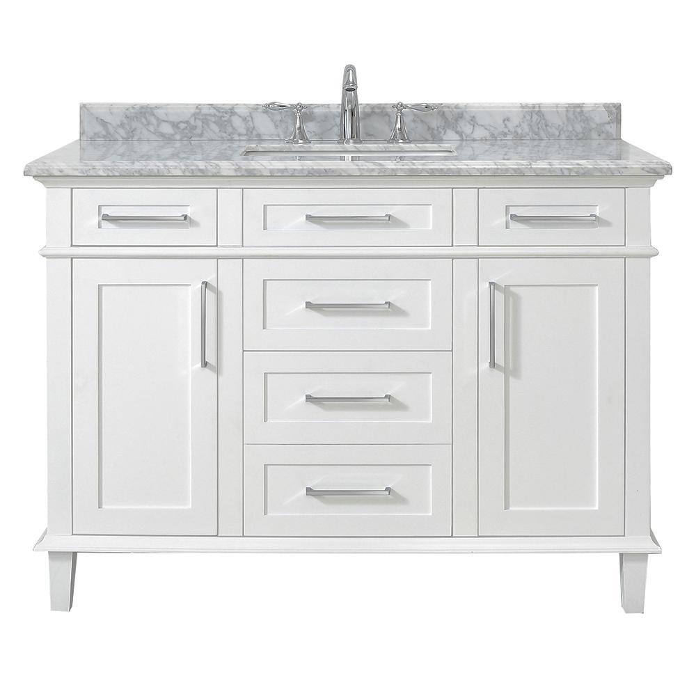 Our Sonoma Vanity offers big style in a restrained design. Slightly tapered legs, recessed panels and simple crown molding create the perfect modern bathroom vanity. Chrome-finished drawer pulls add an understated yet finished look. Crafted of natural marble, the vanity top may contain swirling or veining. These features are part of the natural beauty of stone and have no effect on function or durability.