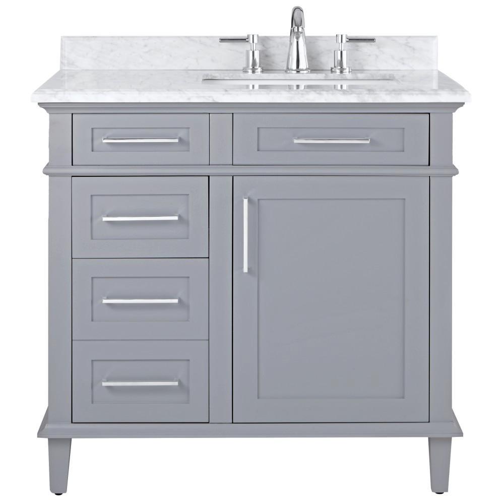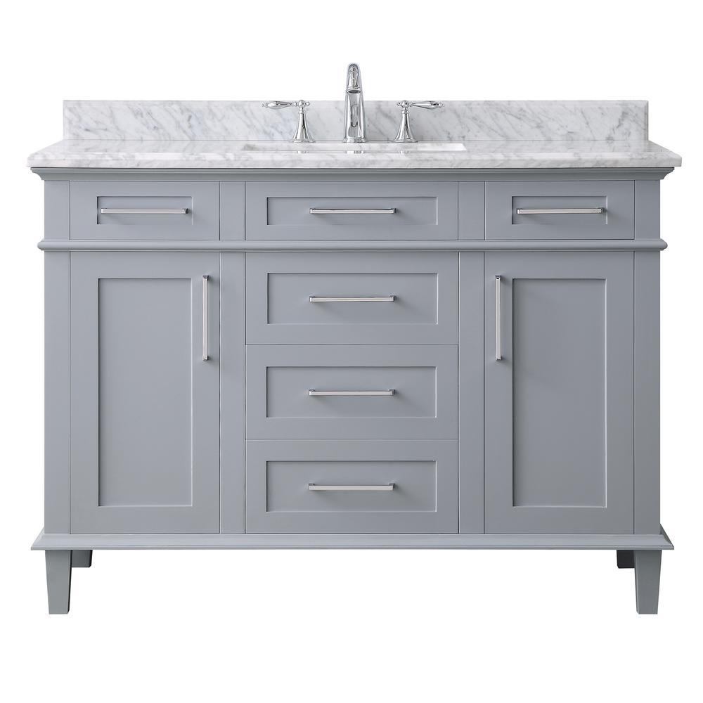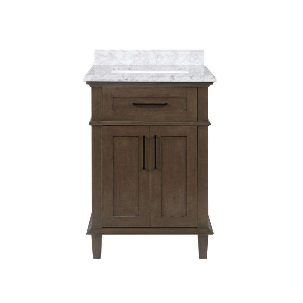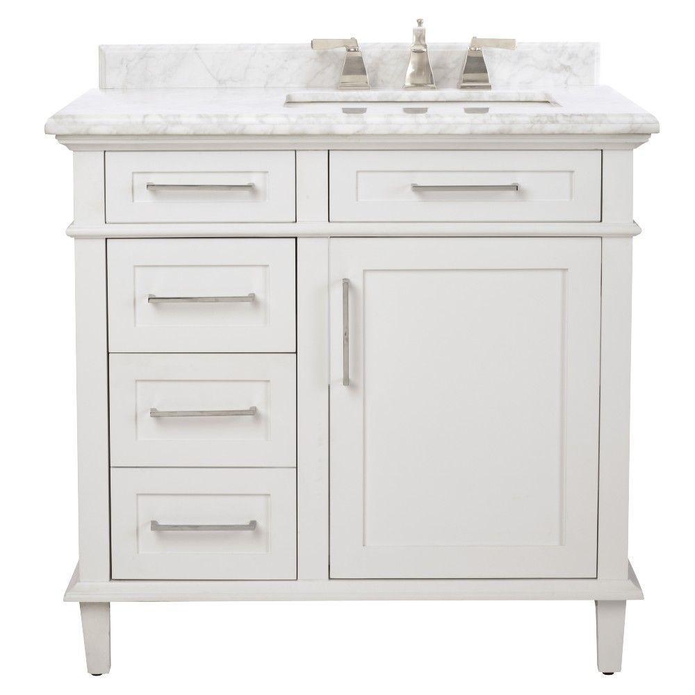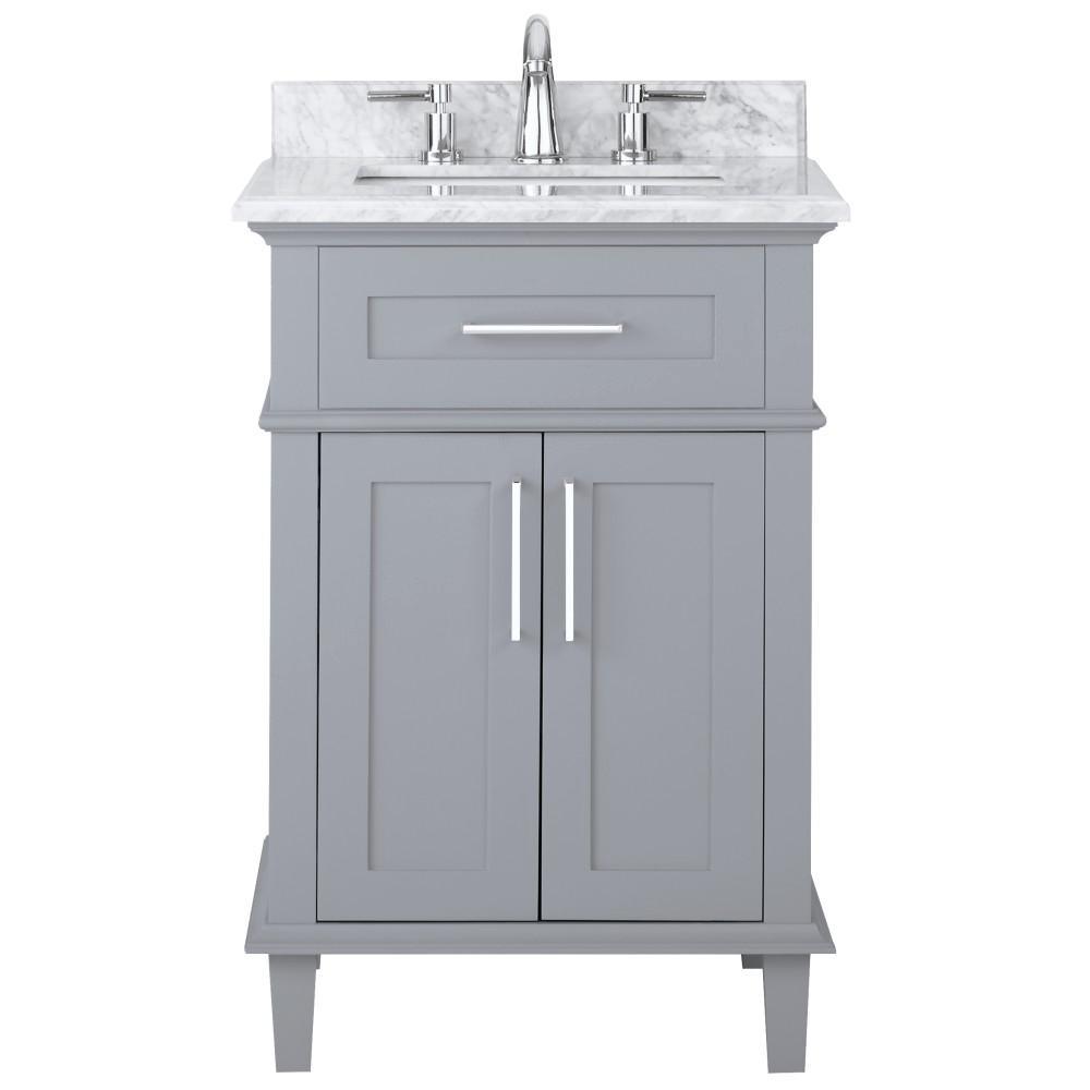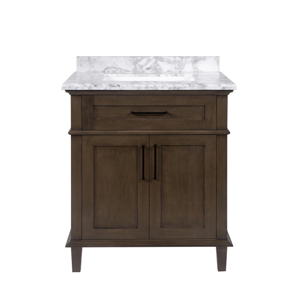 Our Sonoma Vanity offers big style in a restrained design. Slightly tapered legs, recessed panels and simple crown molding create the perfect modern bathroom vanity. Chrome-finished drawer pulls add an understated yet finished look. Crafted of natural marble, the vanity top may contain swirling or veining. These features are part of the natural beauty of stone and have no effect on function or durability.