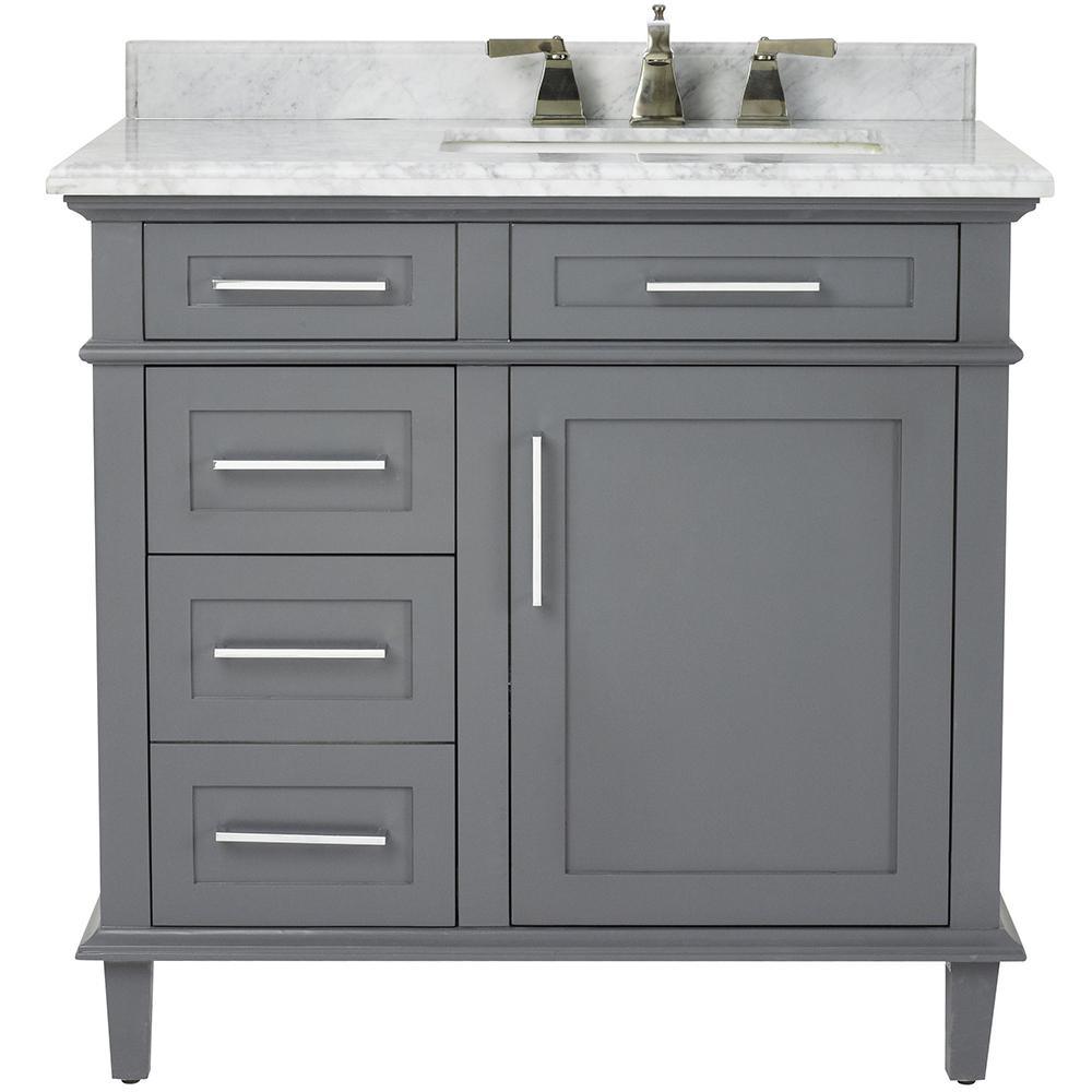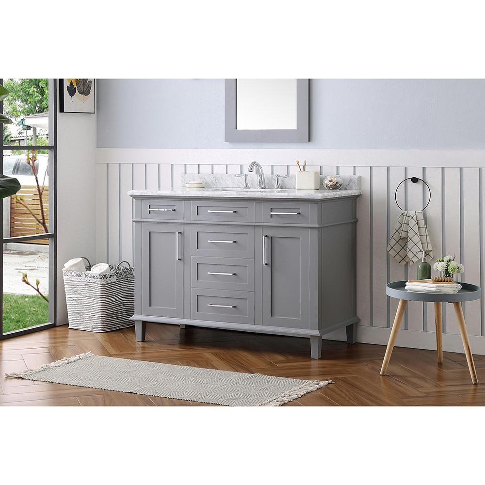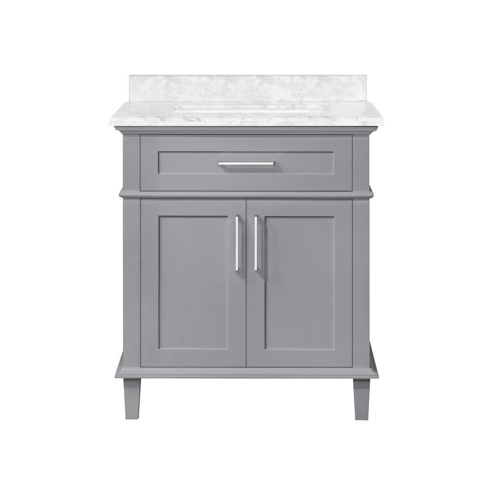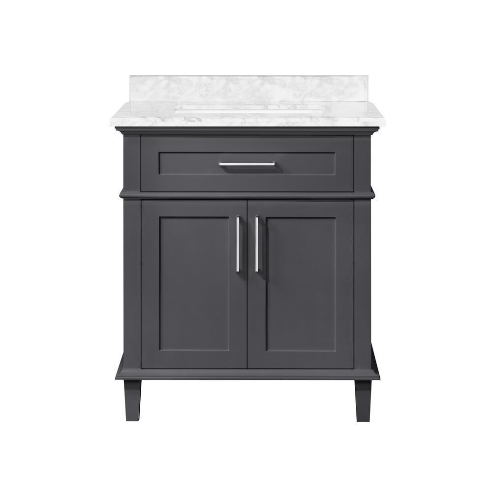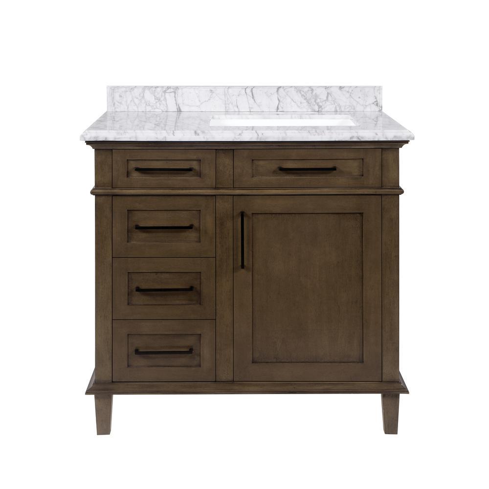 Our Sonoma Vanity offers big style in a restrained design. Slightly tapered legs, recessed panels and simple crown molding create the perfect modern bathroom vanity. Chrome-finished drawer pulls add an understated yet finished look. Crafted of natural marble, the vanity top may contain swirling or veining. These features are part of the natural beauty of stone and have no effect on function or durability.