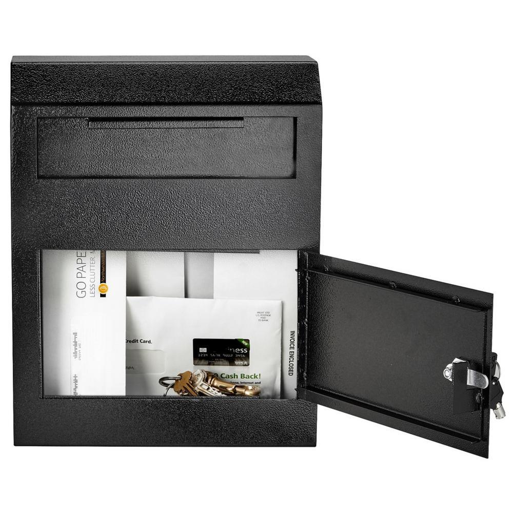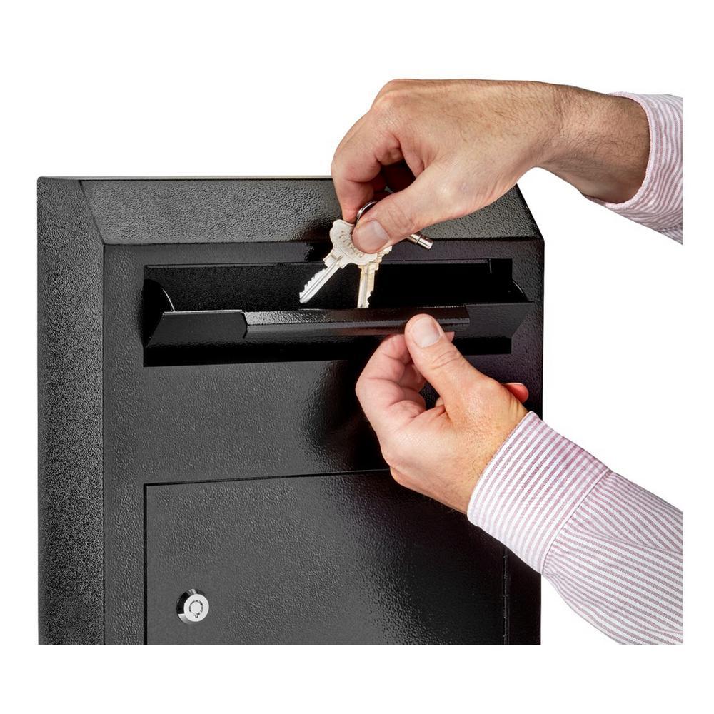 The AdirOffice Heavy-Duty, Secured Safe Drop Box is the perfect solution for receiving and temporarily storing a variety of items after hours or when you are away from your business. Measuring 15 in. H x 12 in. W x 4 in. D, it supplies a generous storage capacity for documents, payments, keys, and other small items. The box is made from heavy-duty steel to provide long-term strength. The drop opening measures 2.3 in. H x 9.8 in. W to accommodate a variety of materials dropped off after hours. Keeping items secure, the drop box safe has construction and design features that discourage unauthorized intrusions. For starters, the steel storage bin door is double-thick and equipped with a replaceable, Double-D cam lock to prevent break-ins. additionally, there are also 2, tubular-type keys that are difficult to duplicate. To make it complete, this multi-purpose drop box is equipped with pre-drilled holes and includes all the necessary hardware and tools so you can quickly and easily install it on any wall or door right out of the box.