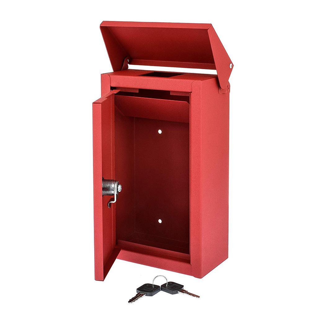 The AdirOffice Outdoor Large Key Drop Box is the perfect solution for key drops, cash envelopes, checks and other valuables at your place of business. Suitable for both indoor and outdoor use made from galvanized, powder-coated steel construction. This outdoor model features a flip-up, slanted lid, fashioned to work as a roof-like cover to protect the contents from rain and other unpredictable outdoor conditions. The box measures 9.5 in H x 5.5 in. W x 3 in. D. A dual-drop design adds utility for both small and larger items. Deposited items can then be retrieved from the box's generous storage capacity, secured by a key lock and a tamper-resistant internal shelf that discourages pilferage. 2 keys are included for easy access inside to collect the contents. The drop box is outfitted with pre-drilled holes on the back and comes complete with mounting hardware for easy installation.