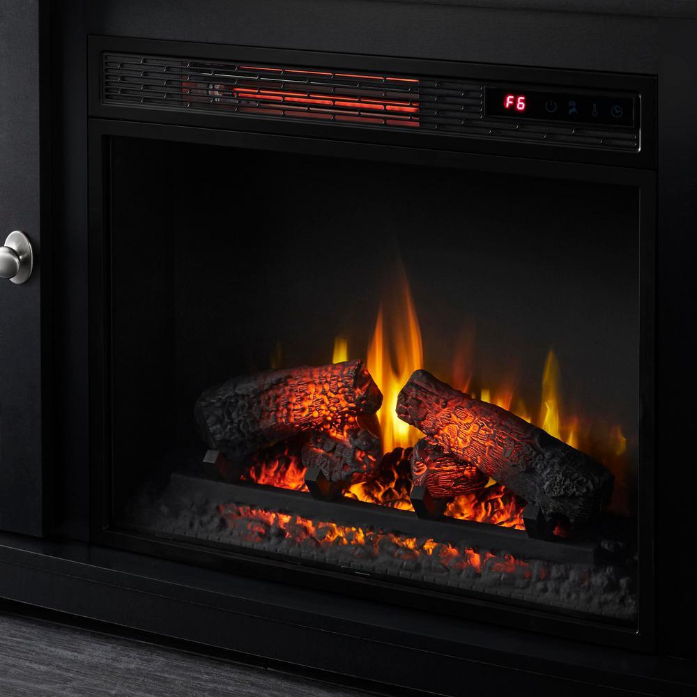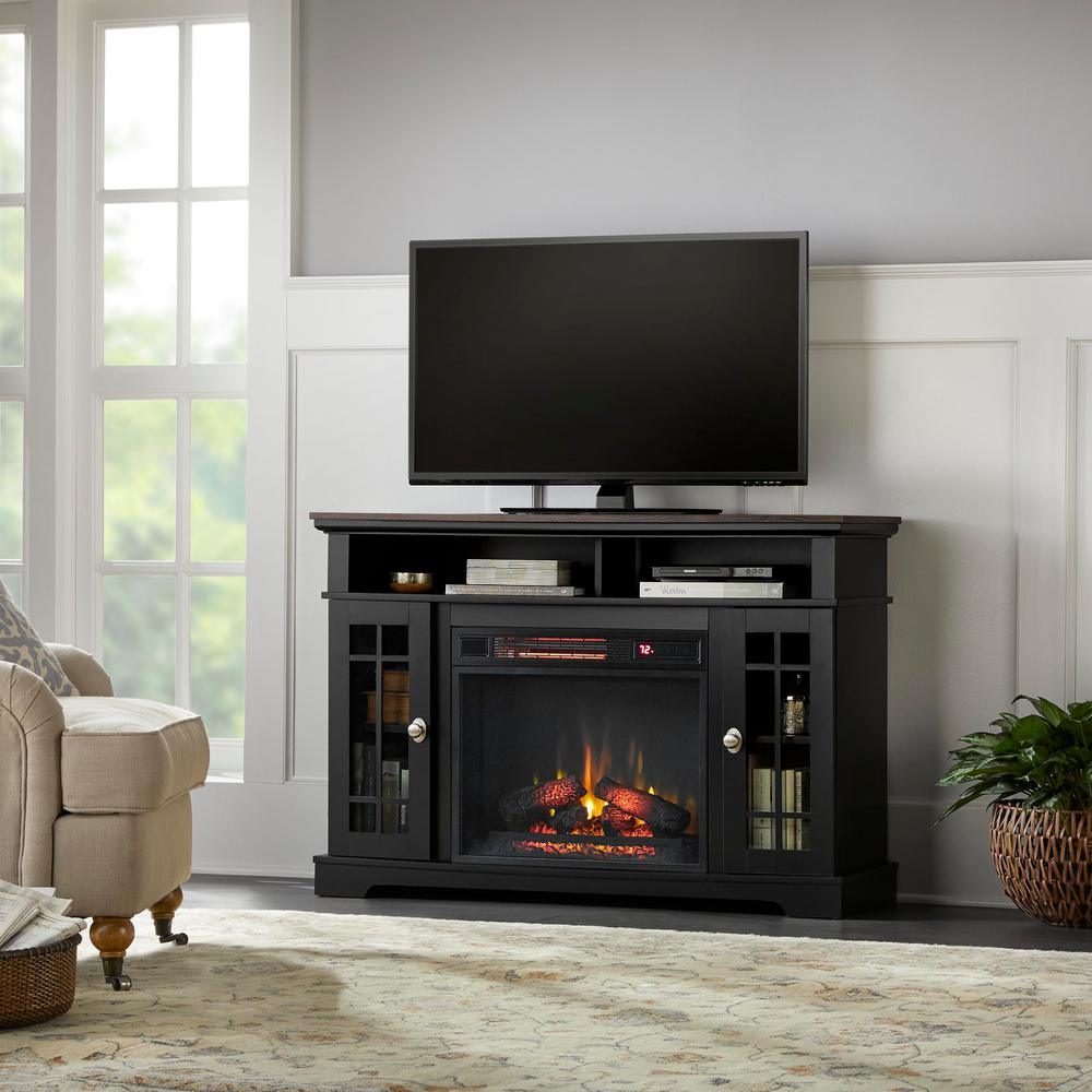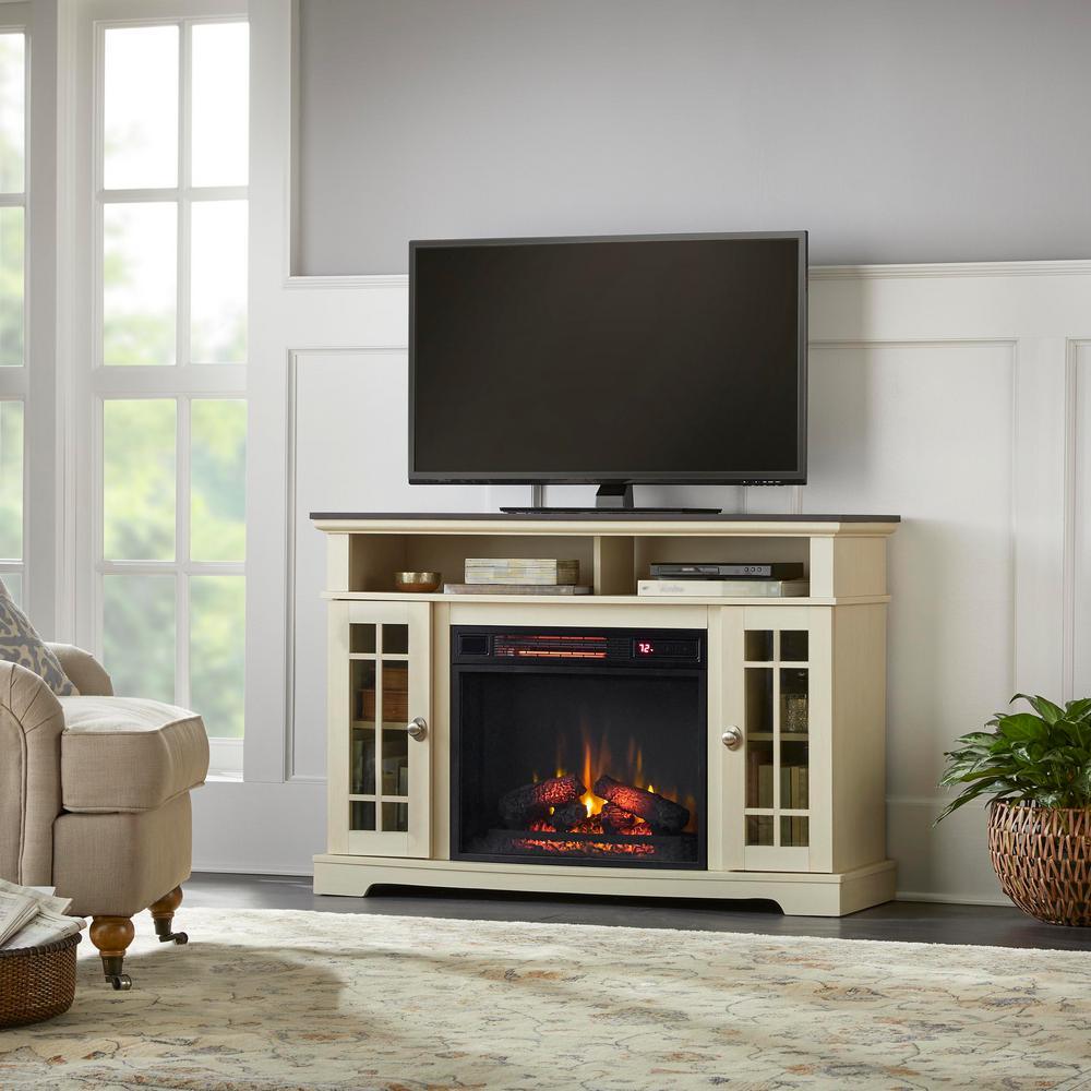 Warmth, ambiance, and style come together in this TV stand with infrared quartz electric fireplace. The supplemental zone heating efficiently heats up to 1,000 sq. ft. of your home so that you can lower electric bills and save money. The infrared quartz technology works to maintain natural humidity for a superior warmth that wont dry out the air. Enjoy the ambiance of your fireplace with or without the heat while the brilliant flames stay on. The Spectrafire flame effect technology offers 3 blue and 3 amber effect options on the realistic log set and ember bed to create your ideal fire experience. The settings are easily controlled using either the control panel on the unit or with the remote control included. Use the center media shelf and side cabinets to store media components and TV accessories while adjustable interior shelves provide customizable storage. This TV stand can hold most flat screen TVs up to 55 in. or up to 55 lbs.