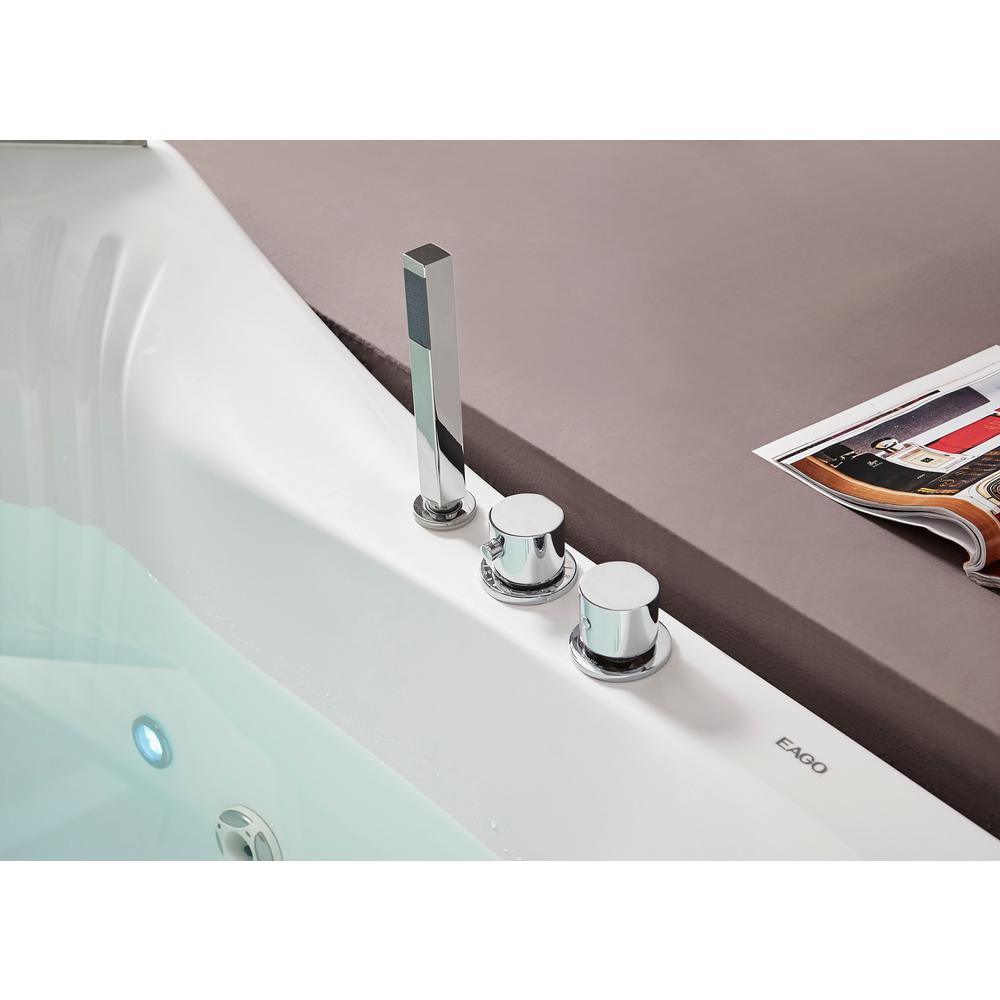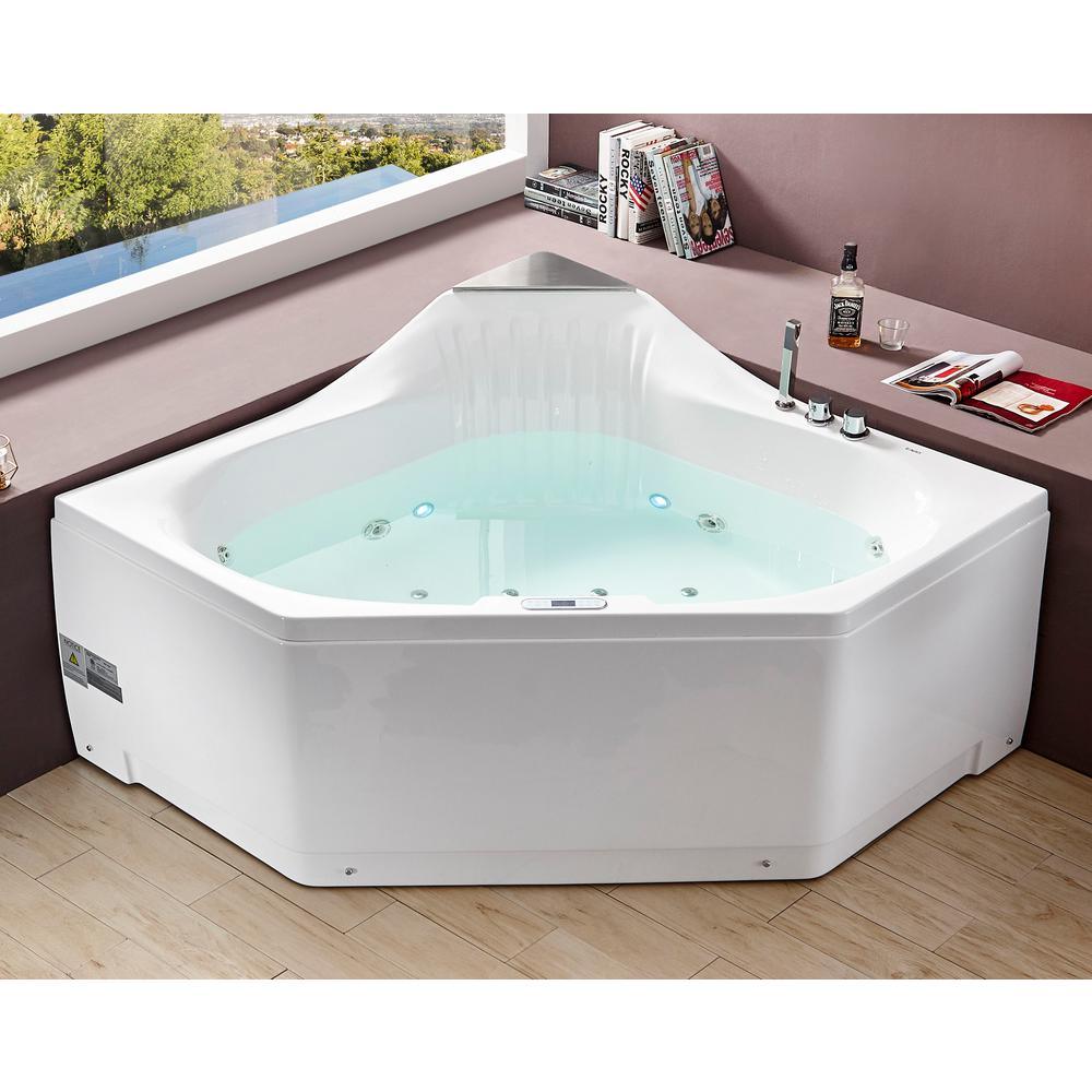 This sleek new corner tub by EAGO incorporates all the modern features of a whirlpool tub inside of a clean cut design with all the bells and whistles. Enjoy a soak while listening to music and blasting the wall and floor hydro jets while the LED-lit up water around you melts the day away. This features an inline heater.