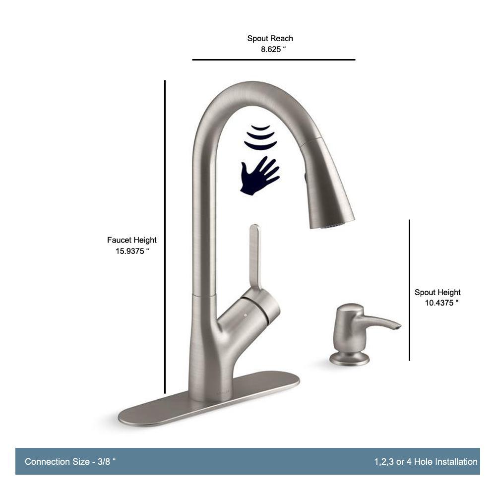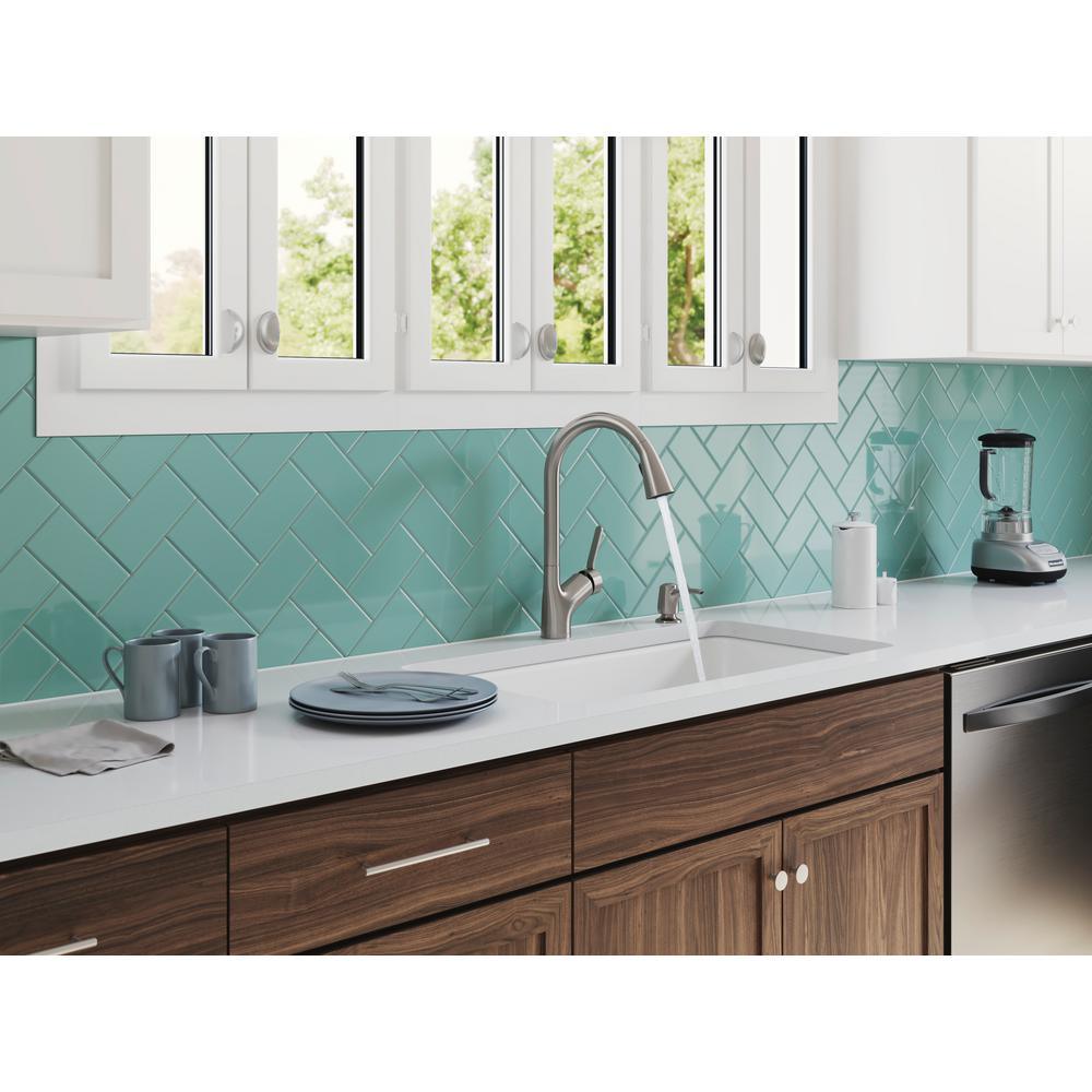 With a modern profile and smooth edges, the Setra touchless kitchen faucet has a sleek aesthetic that blends seamlessly into nearly any kitchen decor. Touchless technology helps reduce messes and makes kitchen tasks easier. Simply wave your hand or an object such as a pan or utensil to turn the faucet on or off. The pull-down spray head featuring Sweep spray delivers a wide, forceful spray, simplifying kitchen cleanup.
